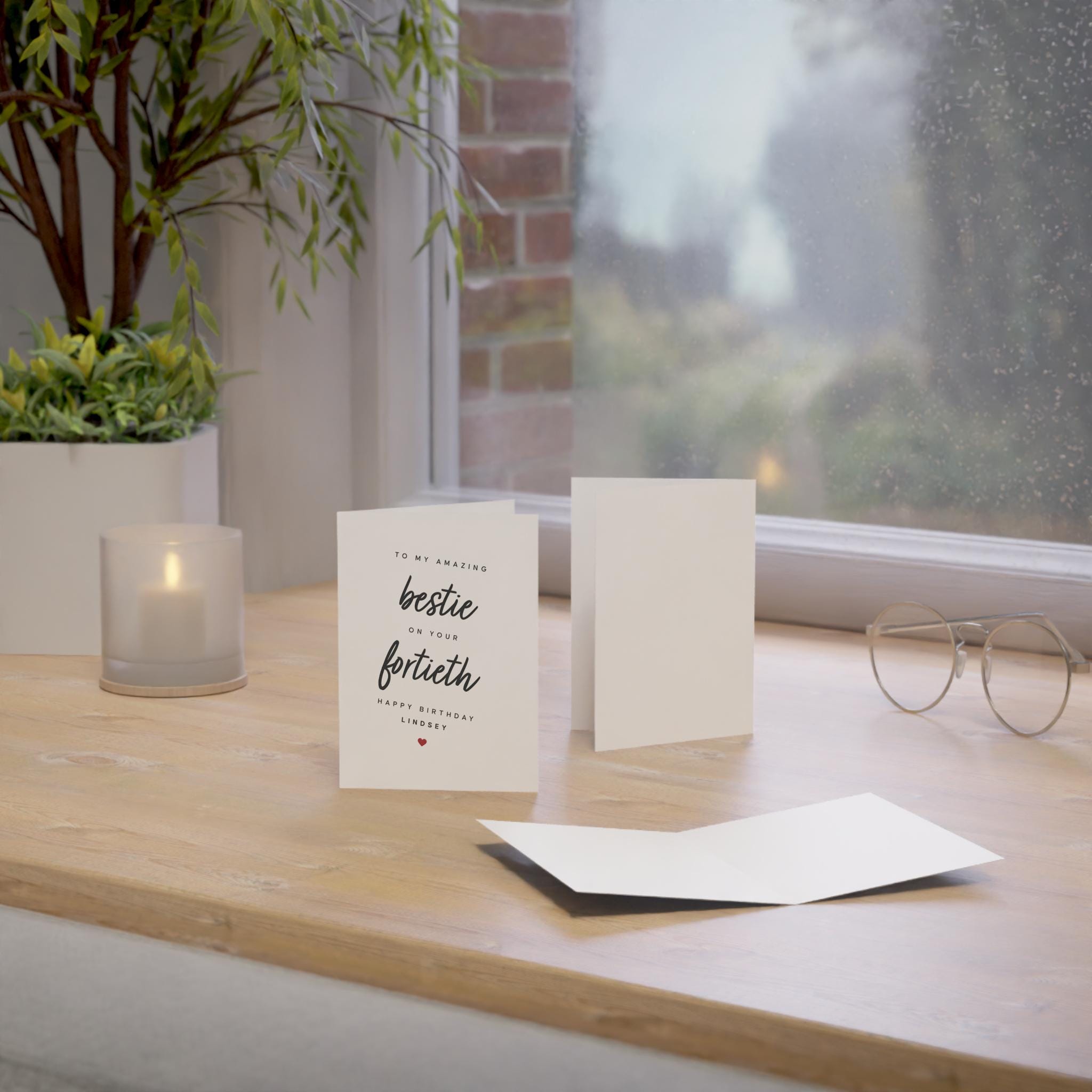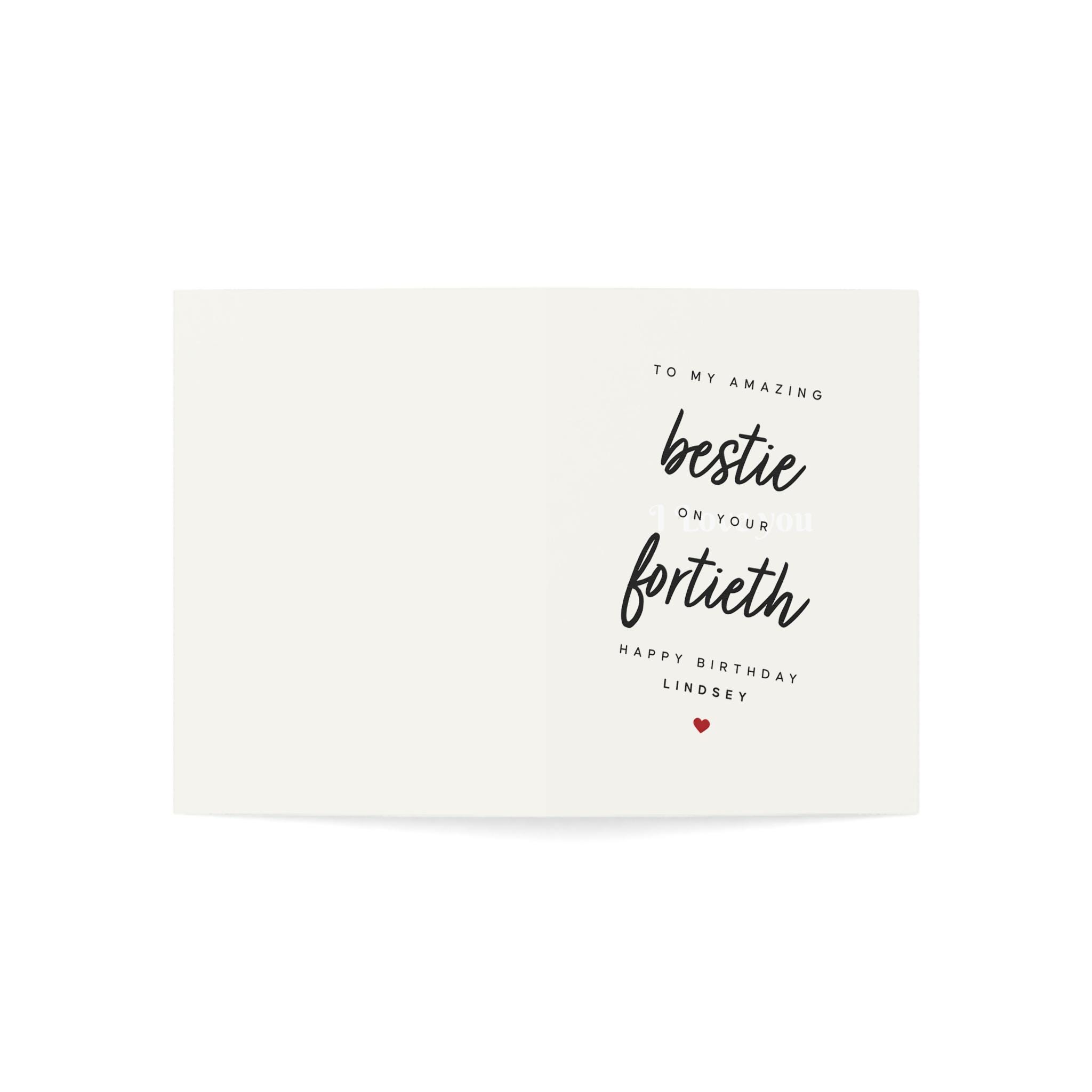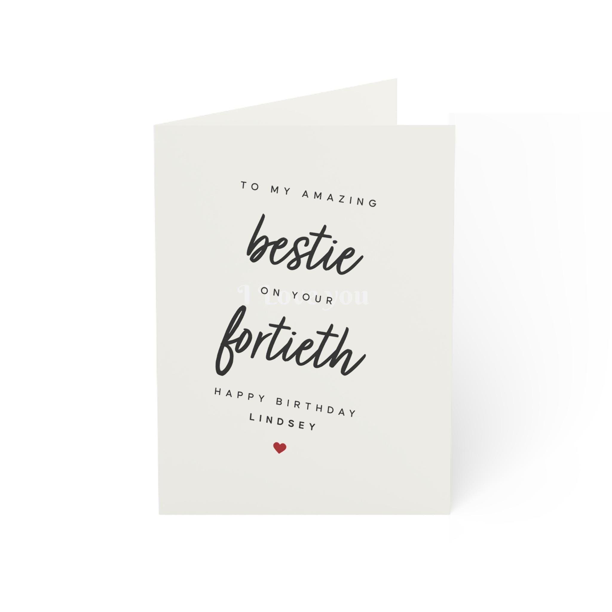 Celebrate your best friend's milestone birthday with this beautifully designed 40th birthday greeting card. Featuring the heartfelt quote, "To my amazing Bestie on your fortieth, Happy Birthday," this card can be personalized with their name to make it extra special.
