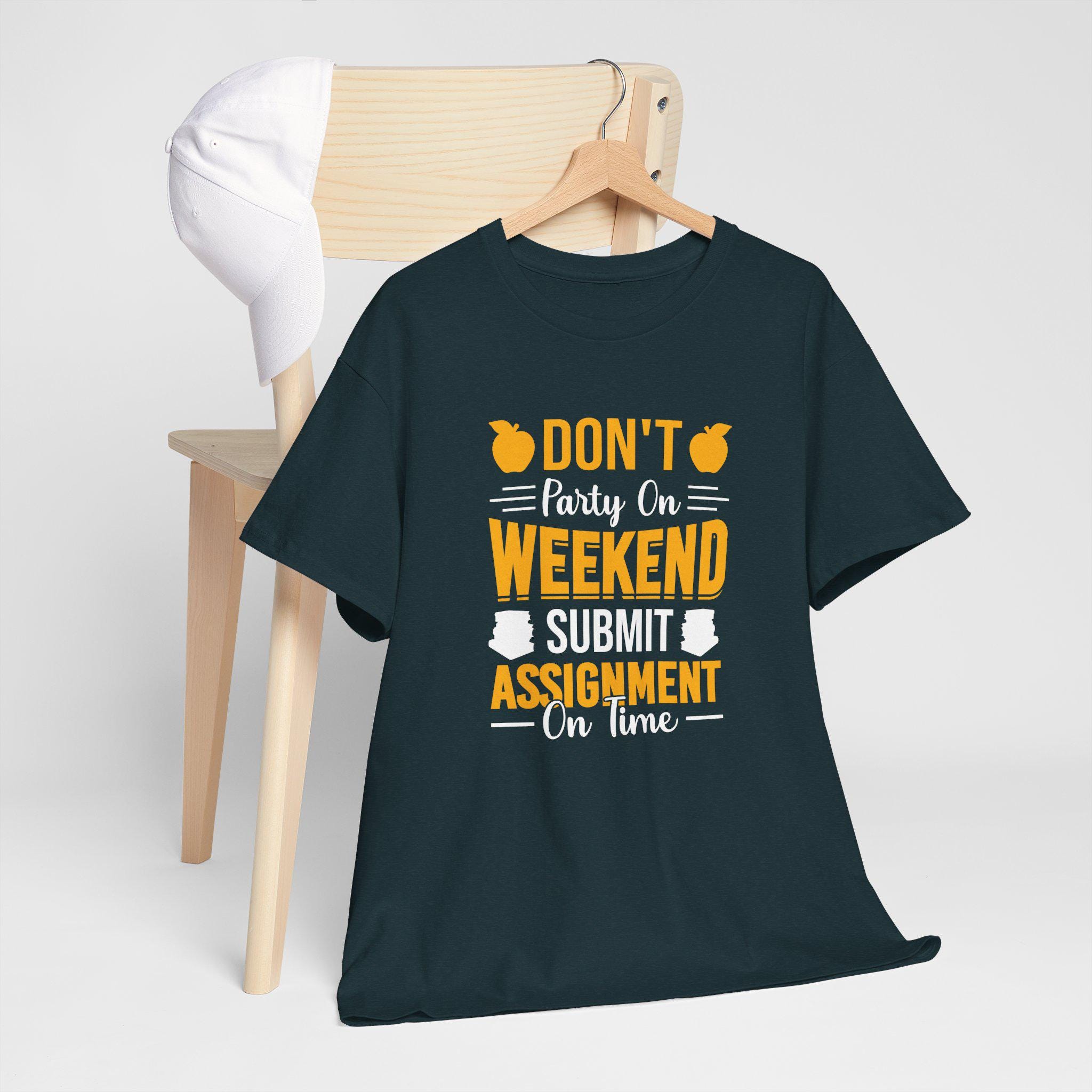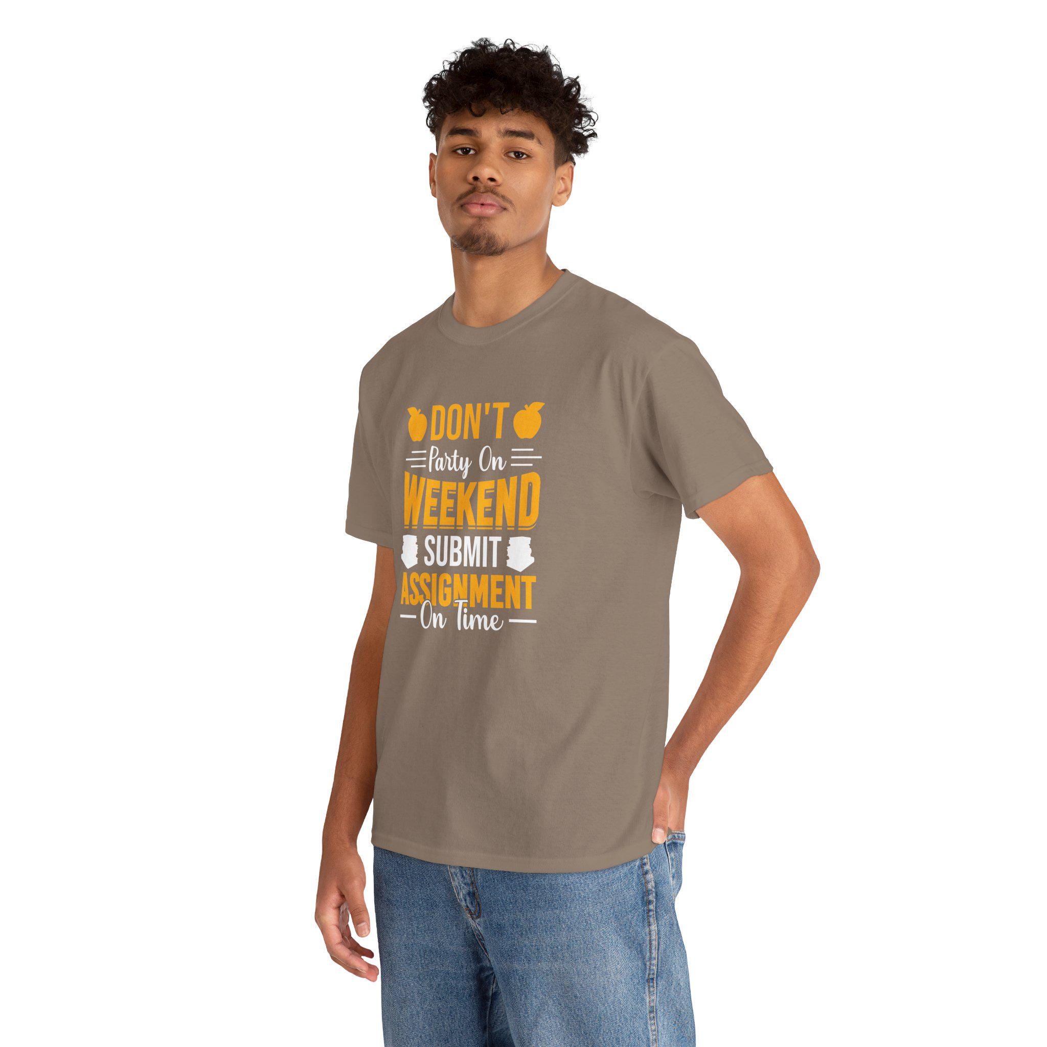 Funny Student T-Shirt - "Don’t Party on Weekend Submit Assignment" - Academic Humor Tee, College Student Tee, Gift for Students, Graphic Tee.