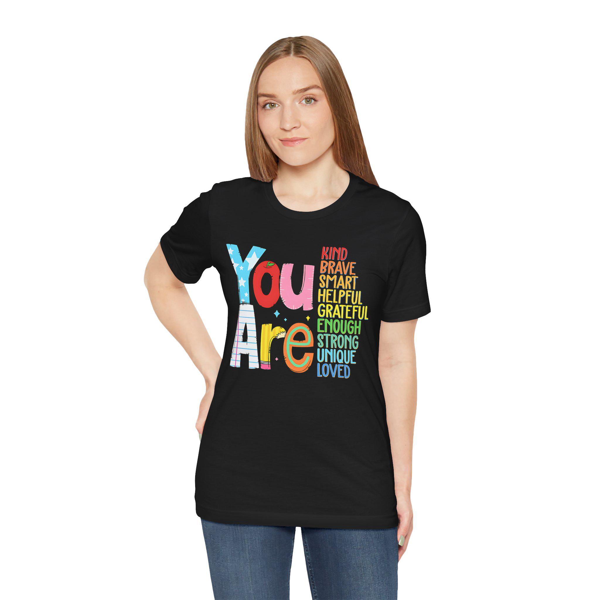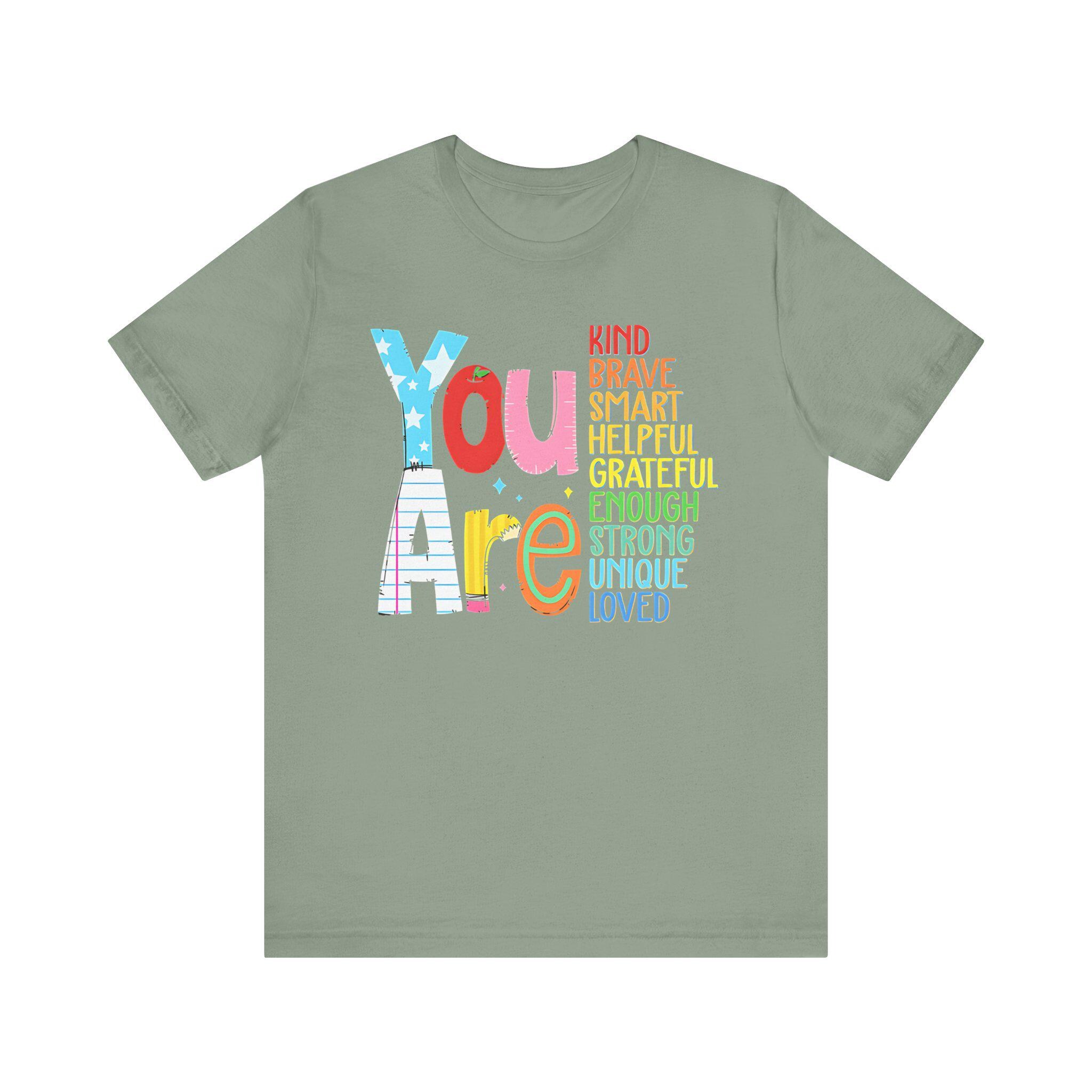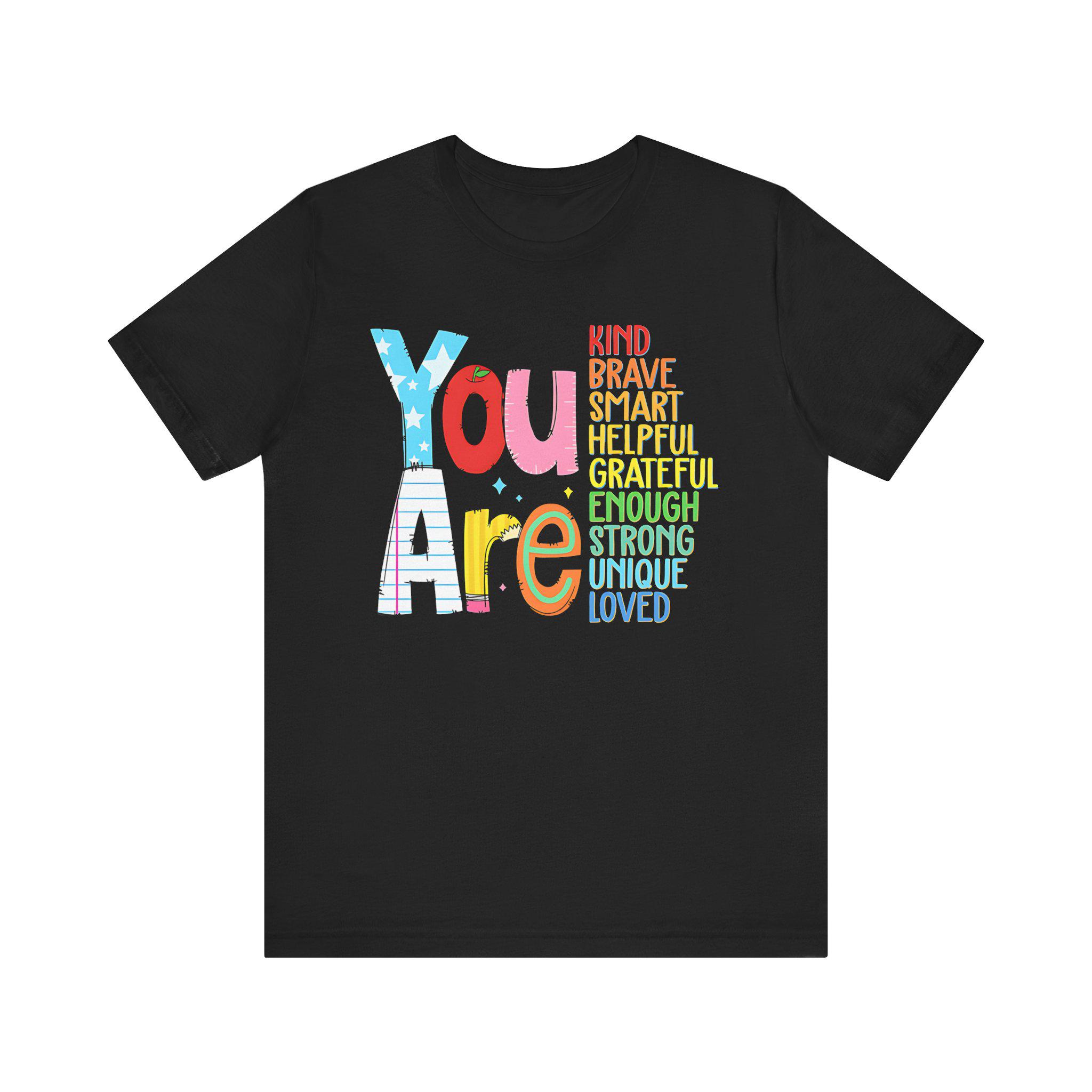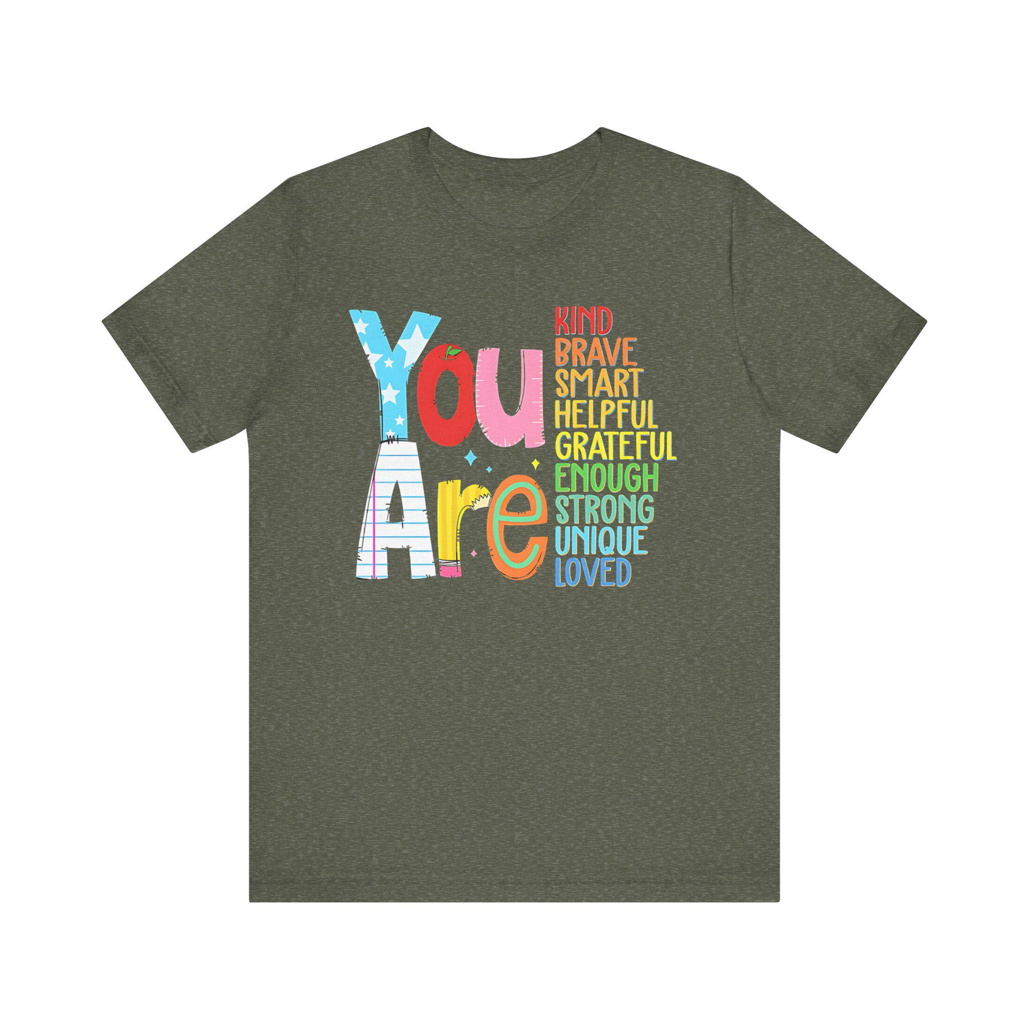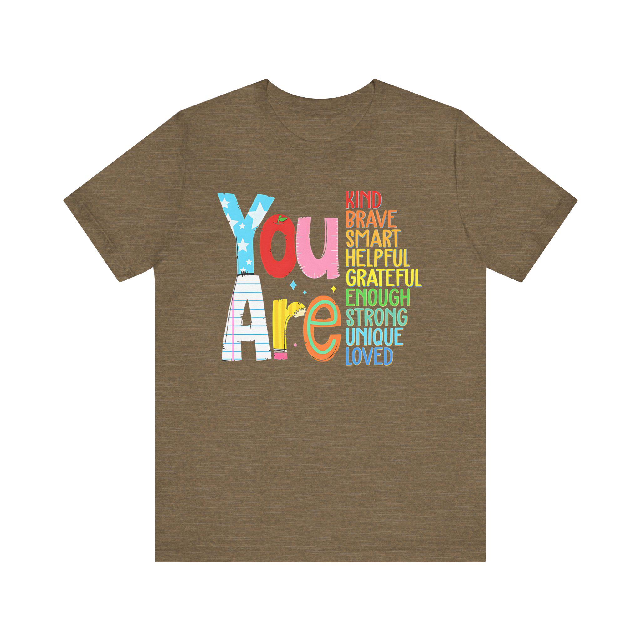 Wear your confidence with the You Are Kind, Brave, Smart, Helpful, Grateful, Unique, Strong, and Loved tee—a shirt that helps you stand tall in all your unique qualities.
