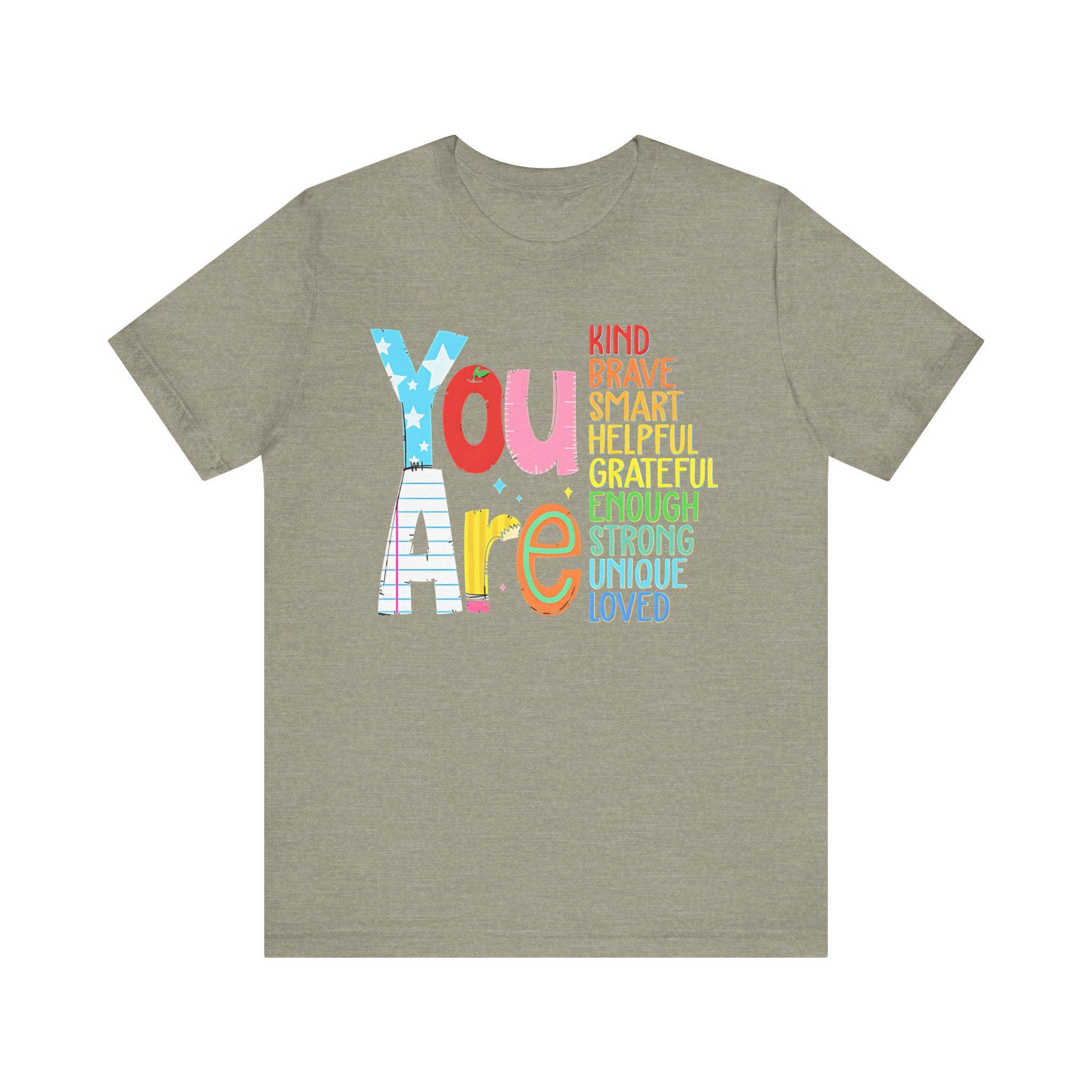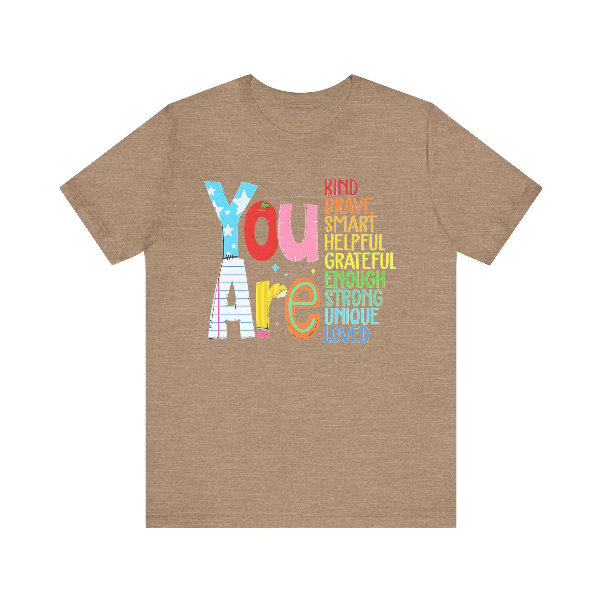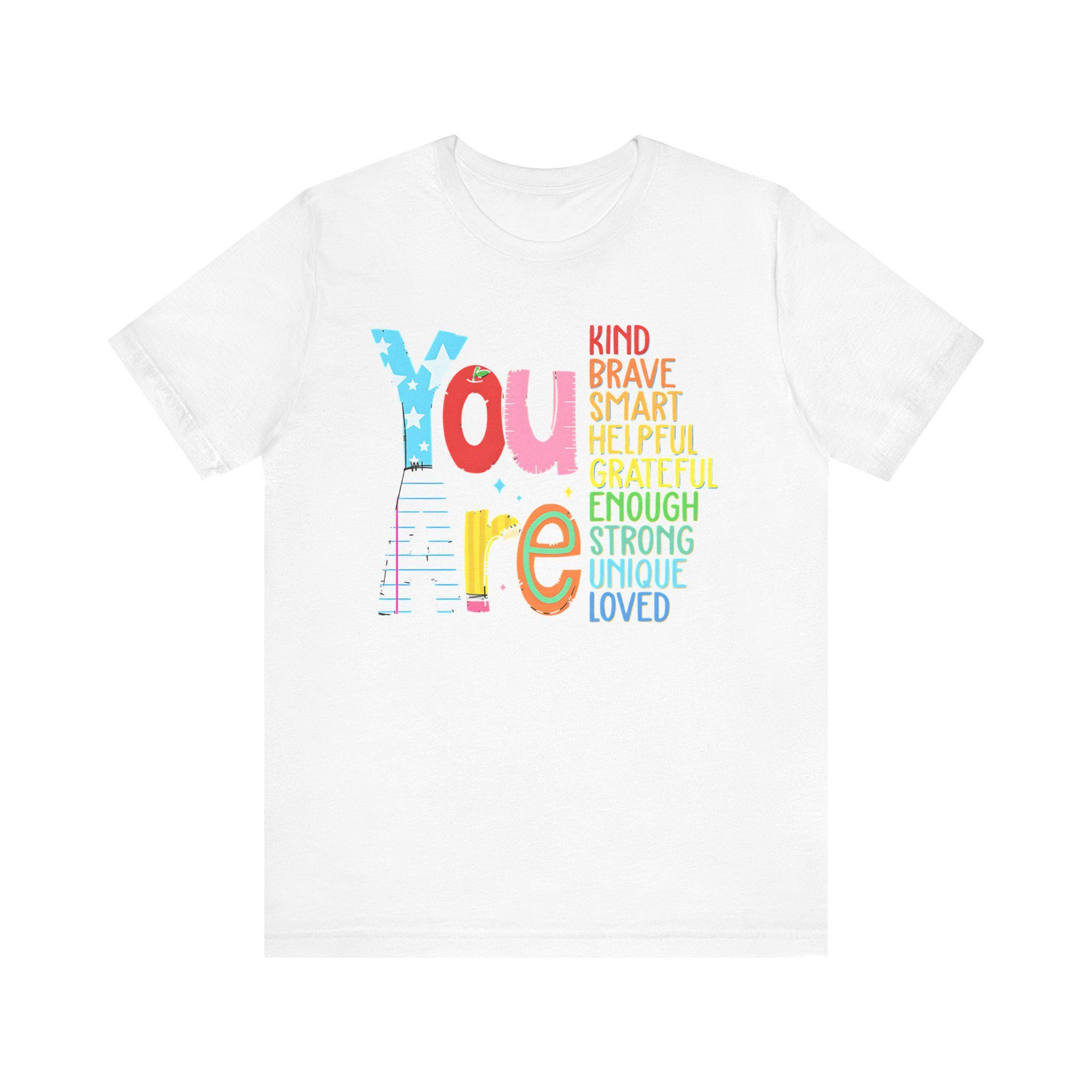 Celebrate all the incredible qualities that make you you with our You Are Kind, Brave, Smart, Helpful, Grateful, Unique, Strong, and Loved Unisex Jersey Short Sleeve Tee. This empowering tee serves as a daily reminder of your strengths, inspiring self-love and confidence in every wearer. Perfect for anyone who needs a little extra positivity and motivation, this shirt helps you embrace your worth and share it with the world.