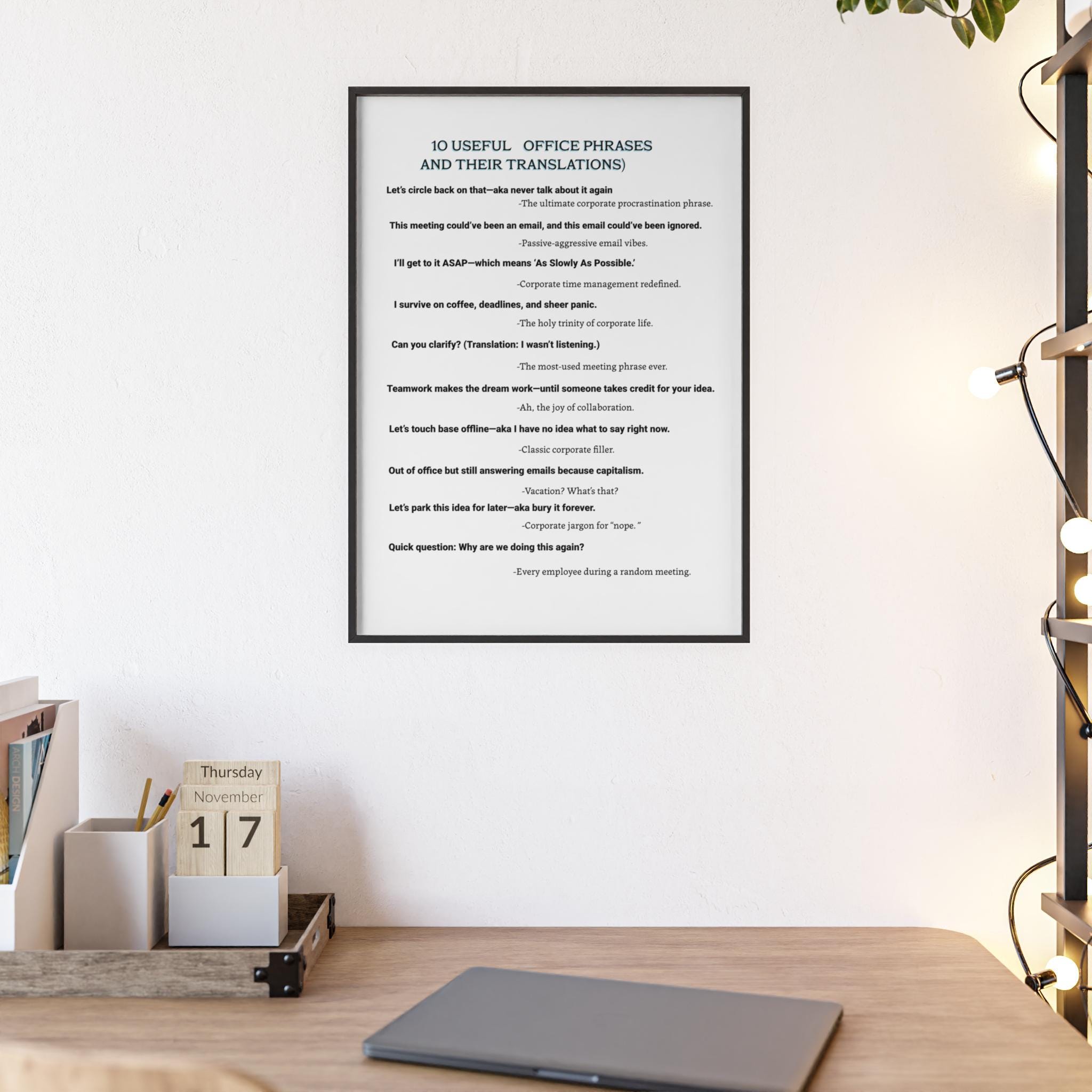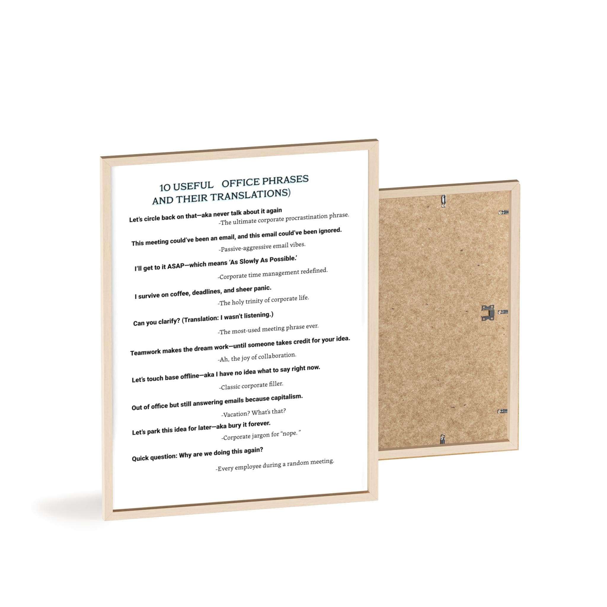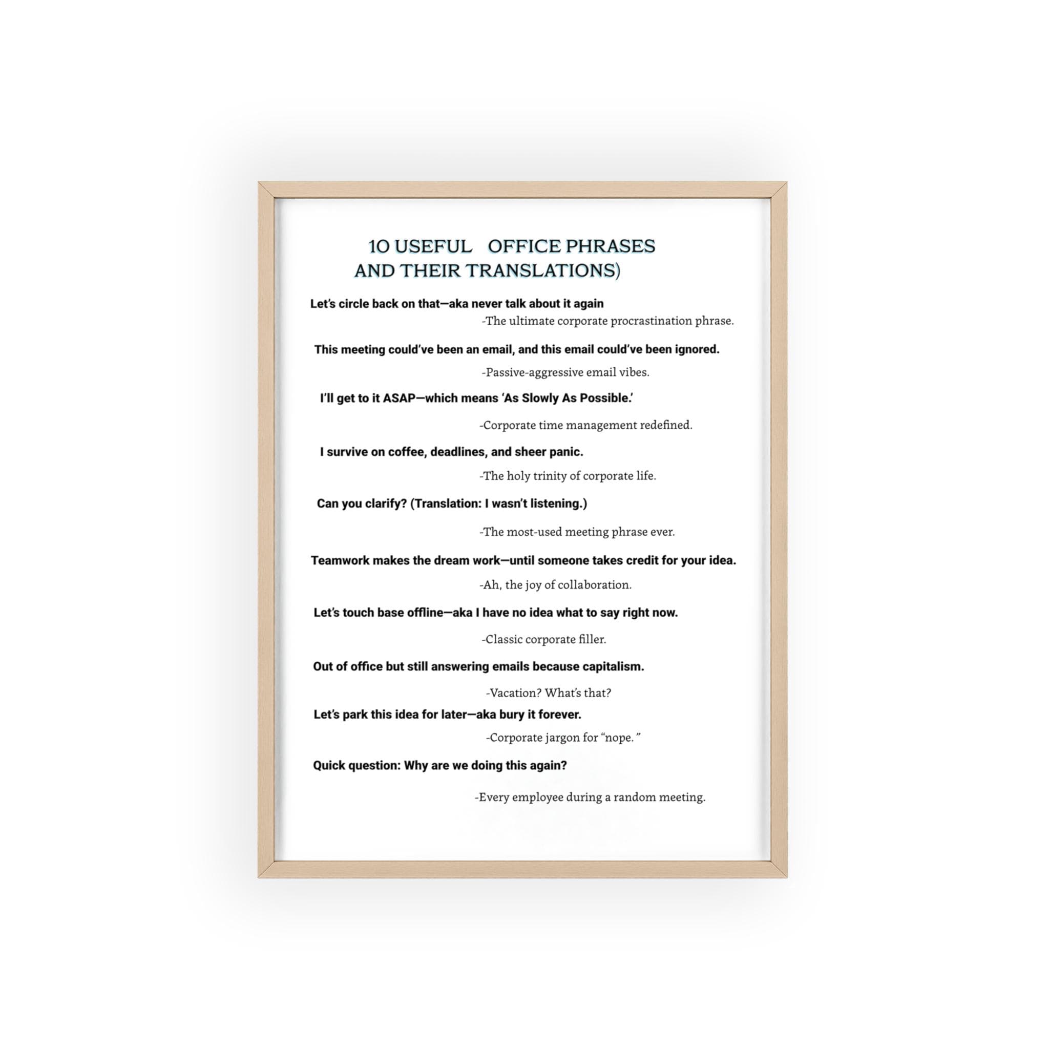 Add some humor to your workspace with our Funny Office Phrases Frame, featuring 10 hilarious office quotes along with their translations. Perfect for lightening the mood in any office, this minimalist design will bring smiles while offering a playful twist on everyday work-life lingo.