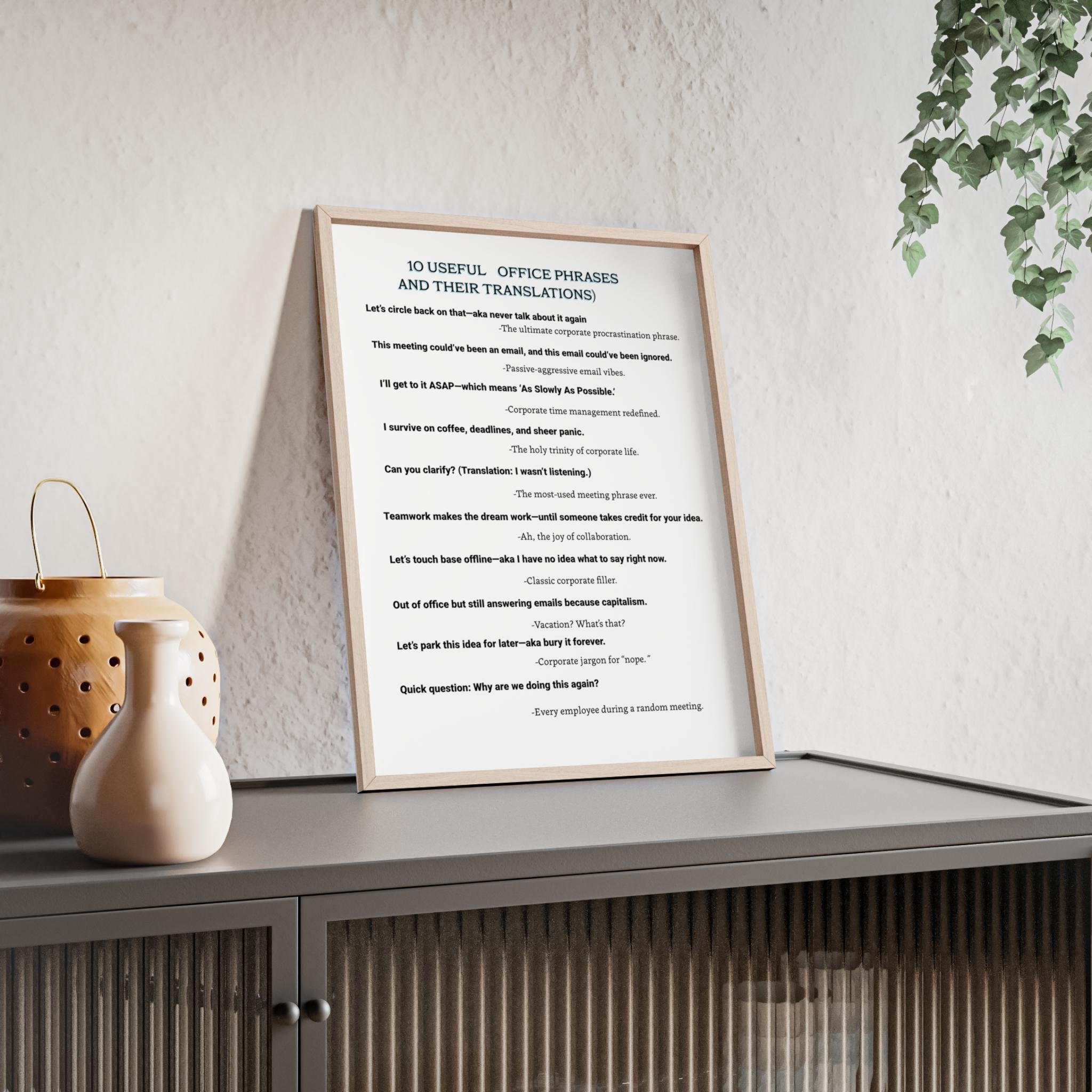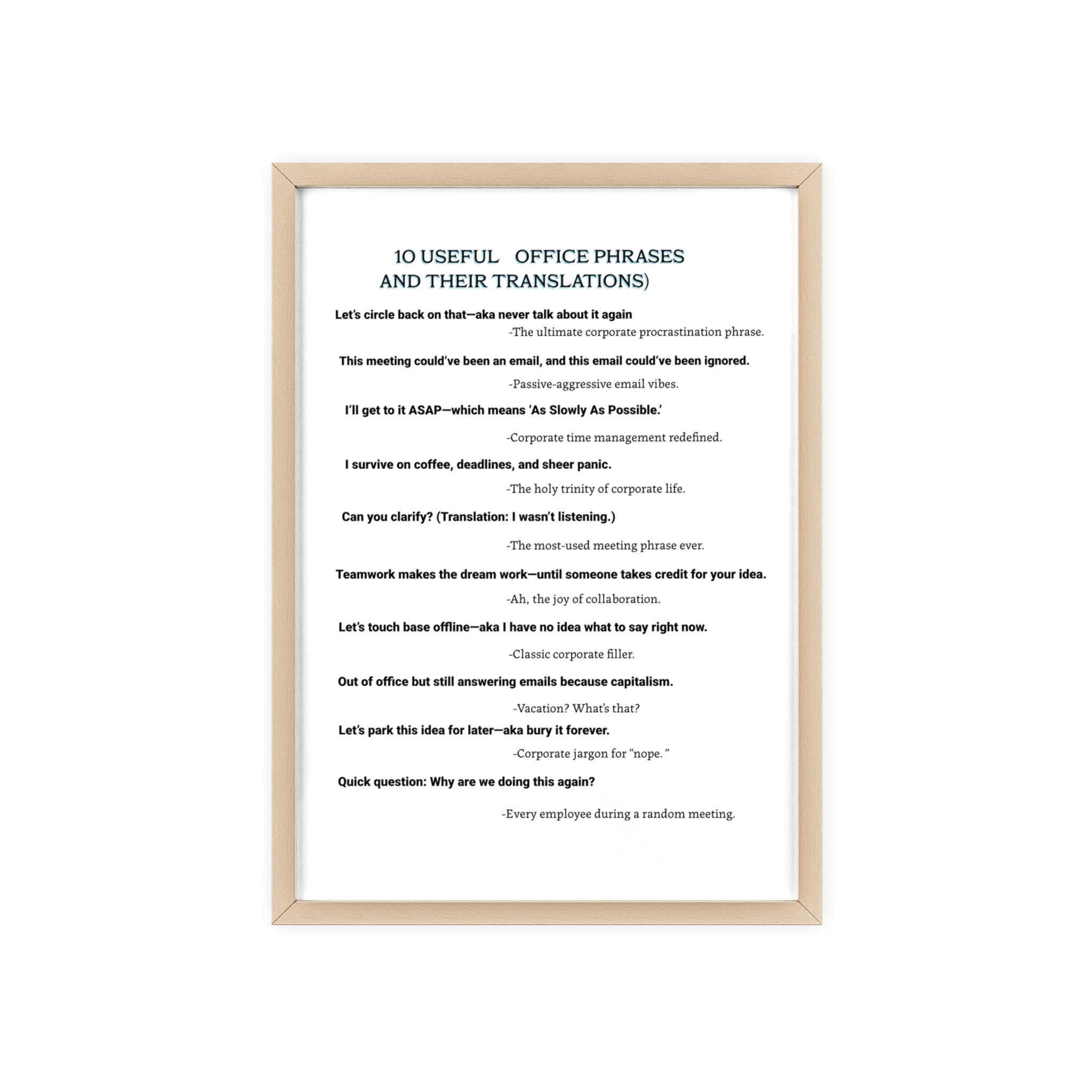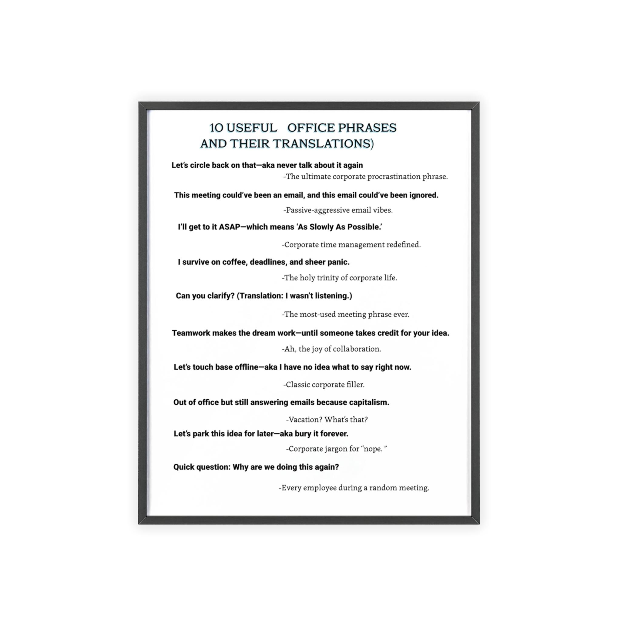 Add some humor to your workspace with our Funny Office Phrases Frame, featuring 10 hilarious office quotes along with their translations. Perfect for lightening the mood in any office, this minimalist design will bring smiles while offering a playful twist on everyday work-life lingo.