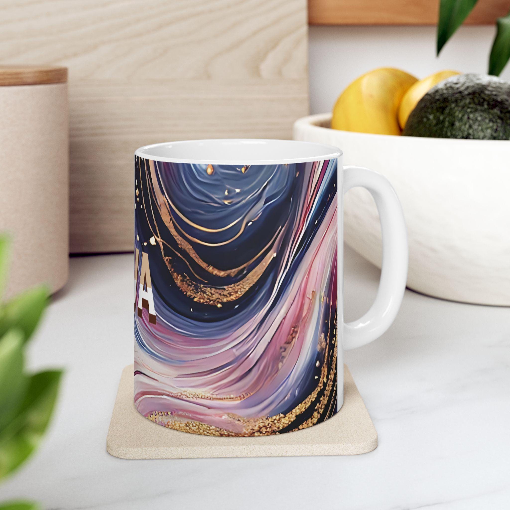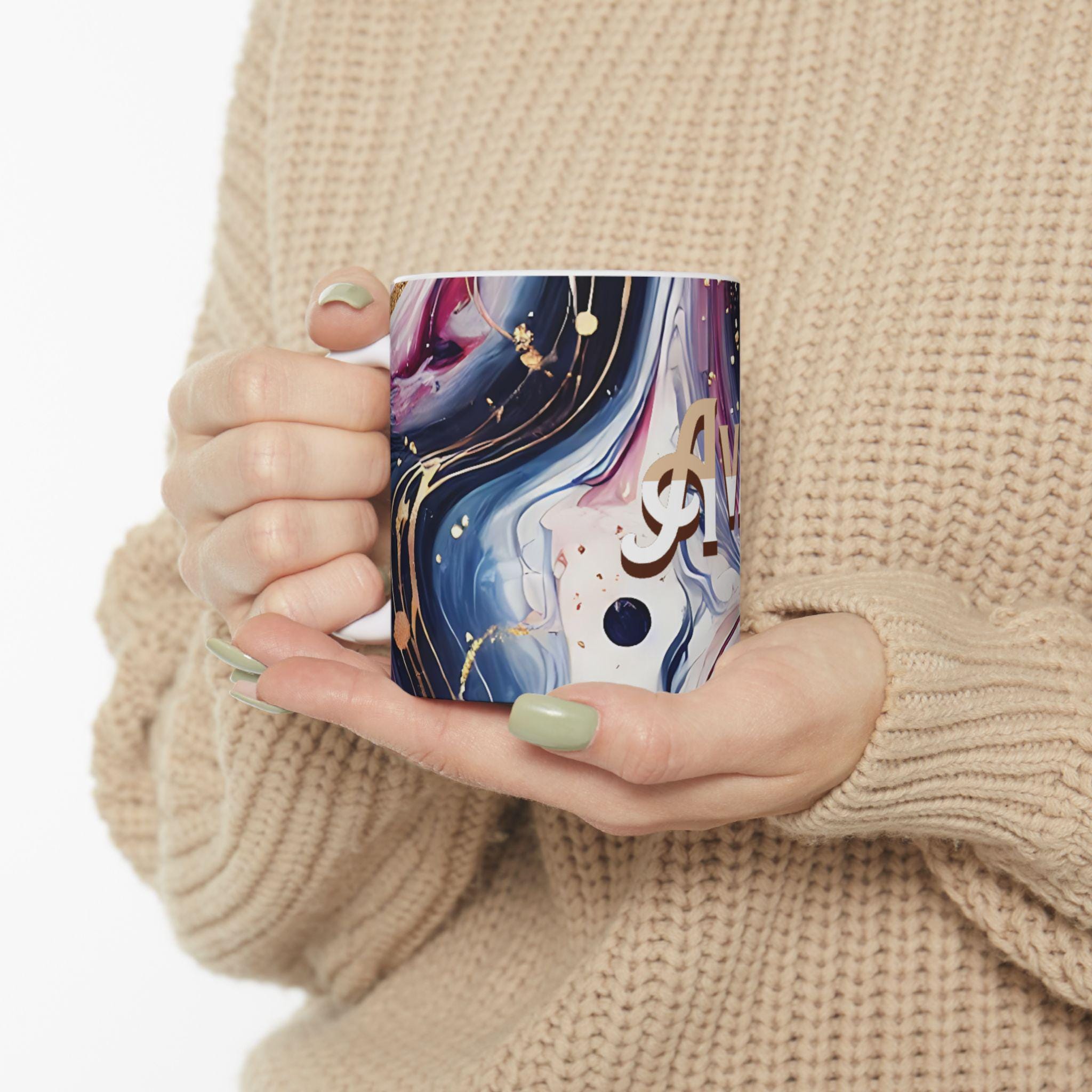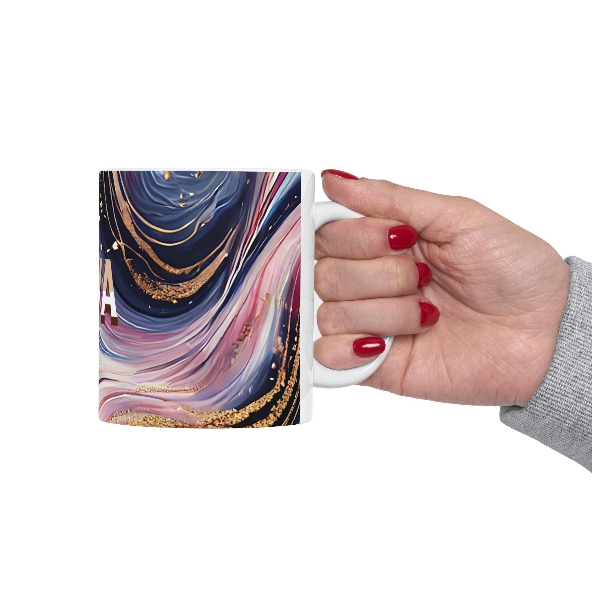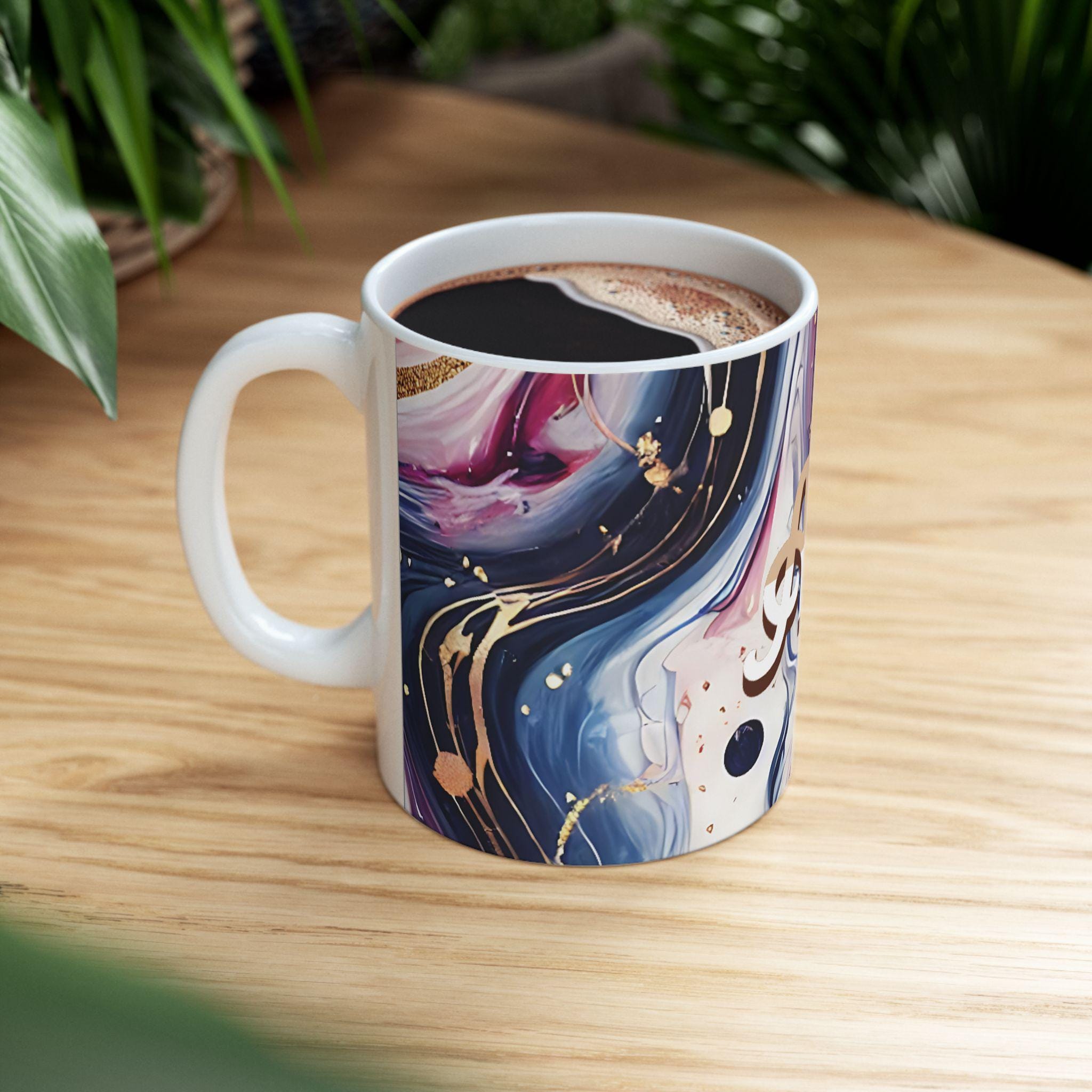 This personalized ceramic mug with an elegant marbled pattern and custom name is a unique gift option for him or her. The stylish design offers a chic vibe and can be a great addition to your morning coffee routine. Perfect for coffee enthusiasts looking for a touch of personalization in their drinkware. Ideal for birthdays, anniversaries, or any special occasion.
