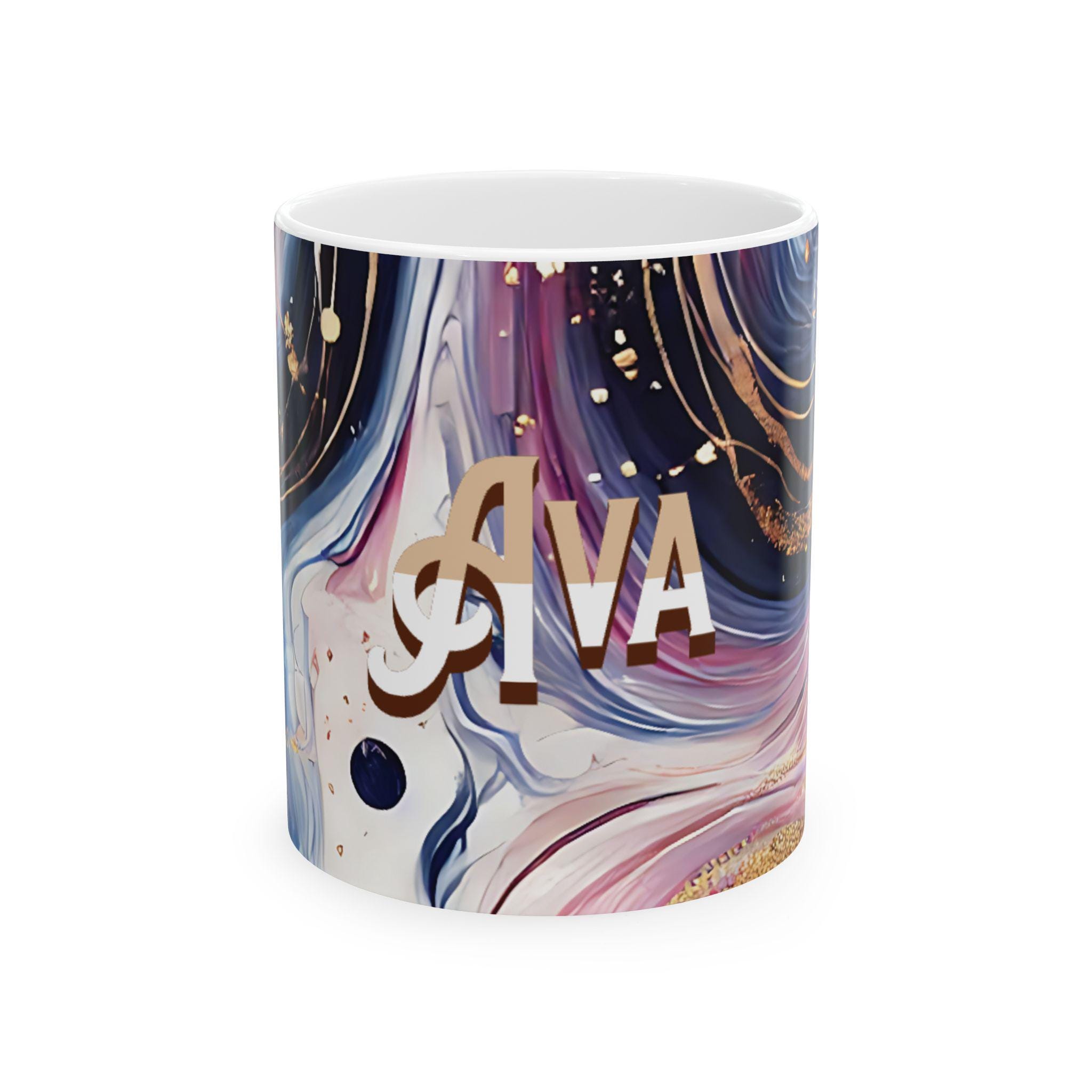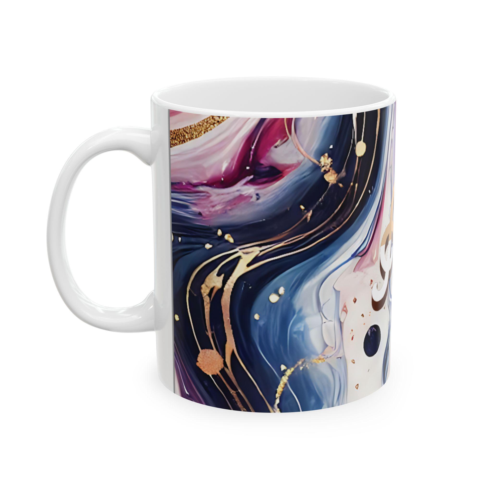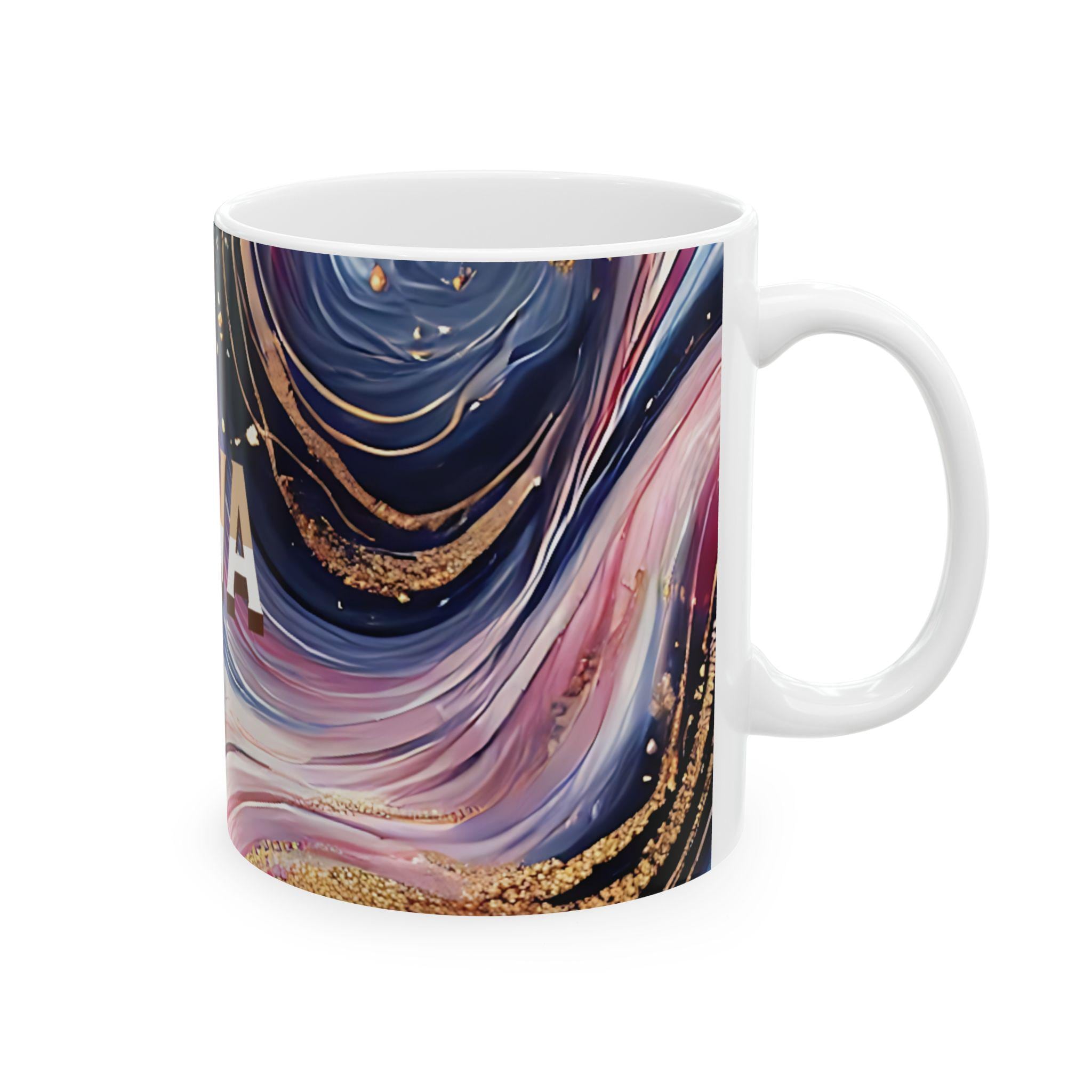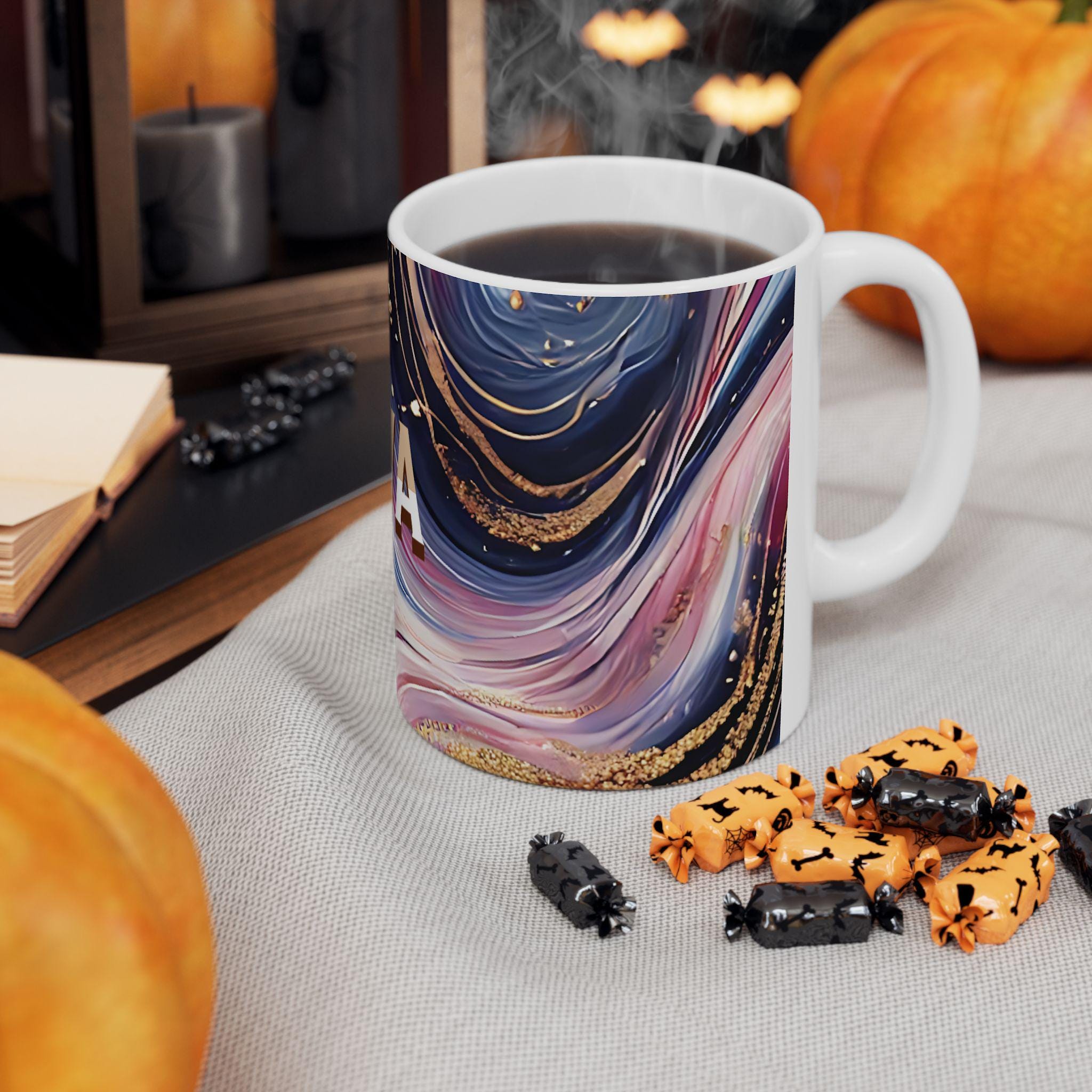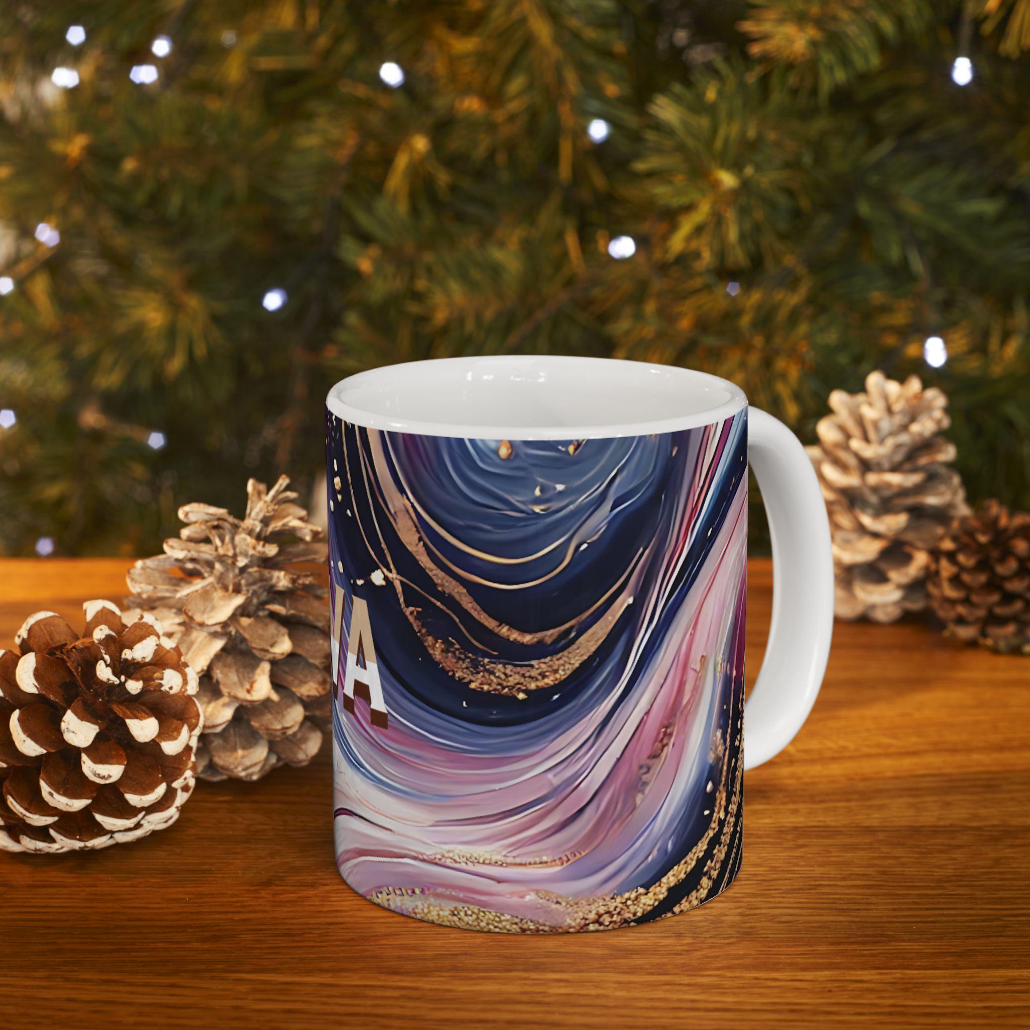 This personalized ceramic mug with an elegant marbled pattern and custom name is a unique gift option for him or her. The stylish design offers a chic vibe and can be a great addition to your morning coffee routine. Perfect for coffee enthusiasts looking for a touch of personalization in their drinkware. Ideal for birthdays, anniversaries, or any special occasion.