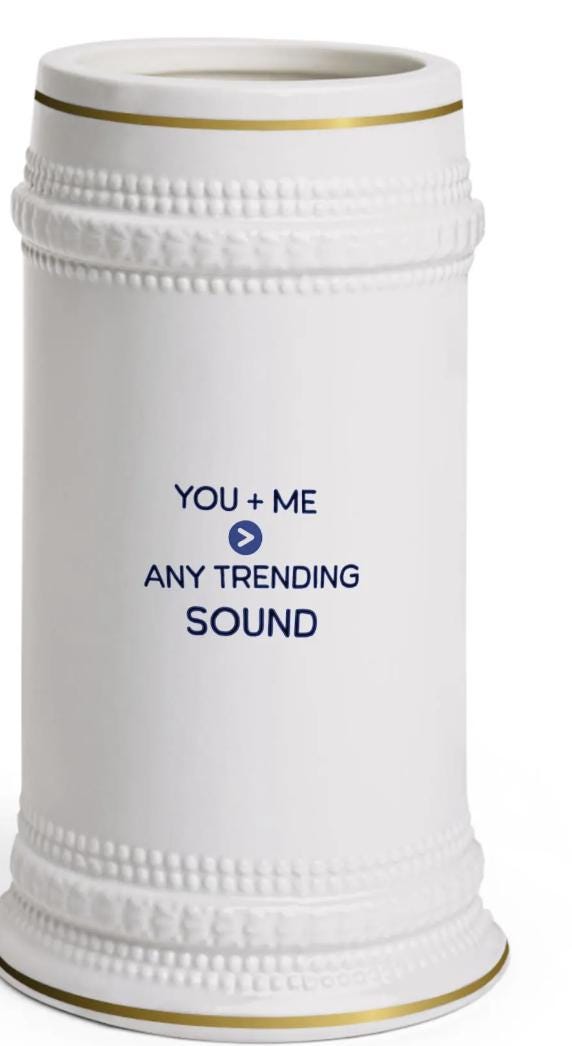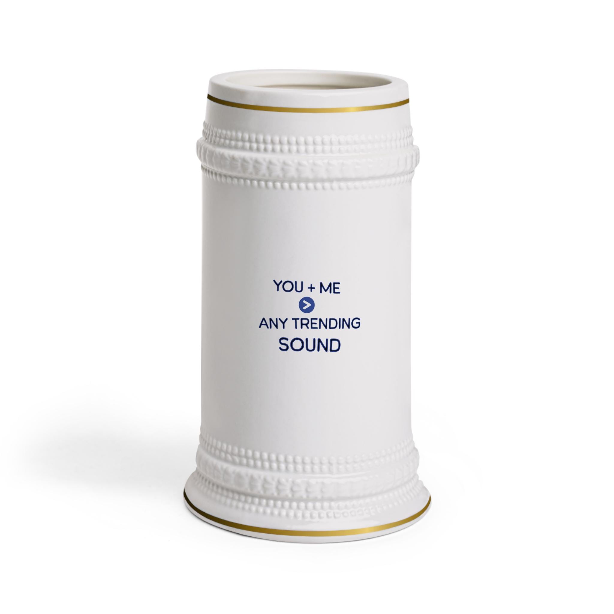 Celebrate love with this stunning beer stein mug featuring the Trendy Gen Z, techy quote, You + Me > trending Sound' . This unique and stylish mug is the perfect gift for couples, anniversaries, Valentine’s Day, or just to remind someone special of the bond you share. With its classic design and meaningful message, this beer stein is both a practical and thoughtful keepsake.