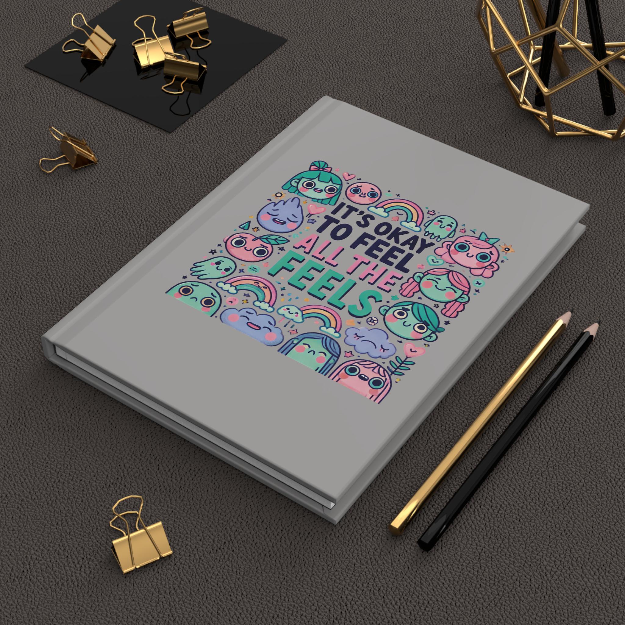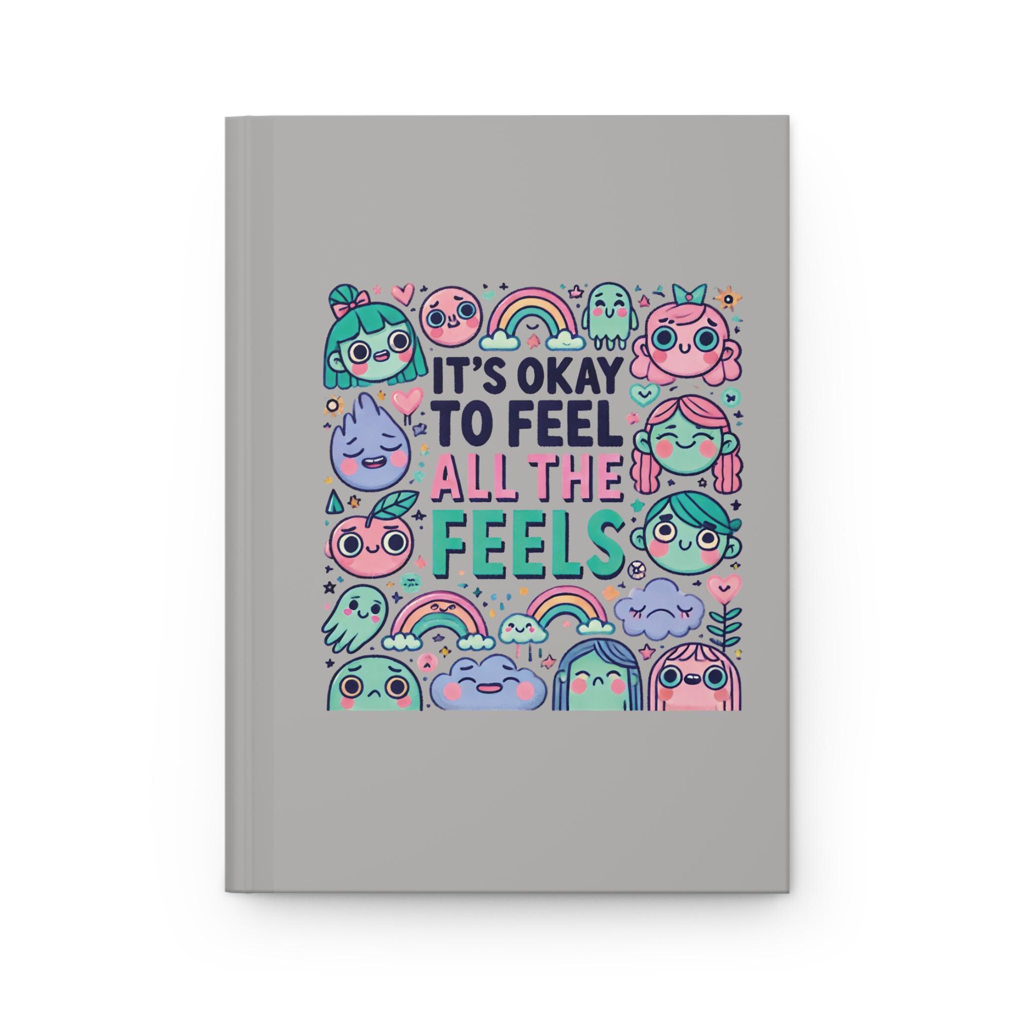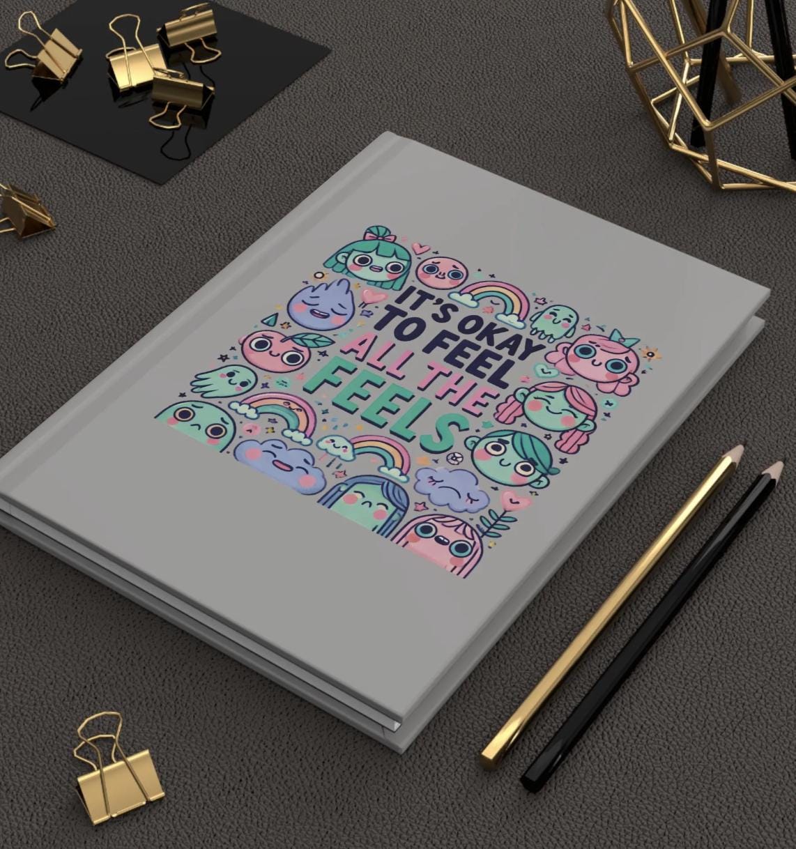A vibrant matte finish journal featuring the quote, 'It okay to feel all the feels.' This journal allows you to express your emotions and thoughts stylishly and durably. Perfect for those who love to journal or as a thoughtful gift for friends and family. Relevant for self-care, mental health awareness, and everyday journaling.