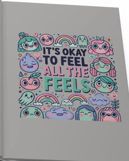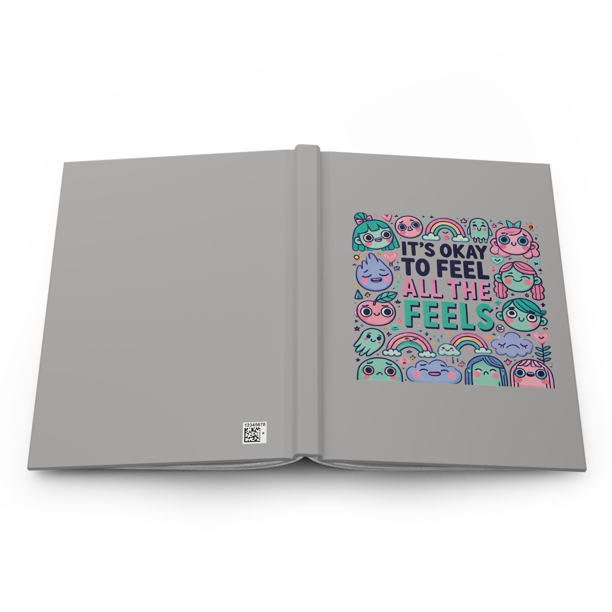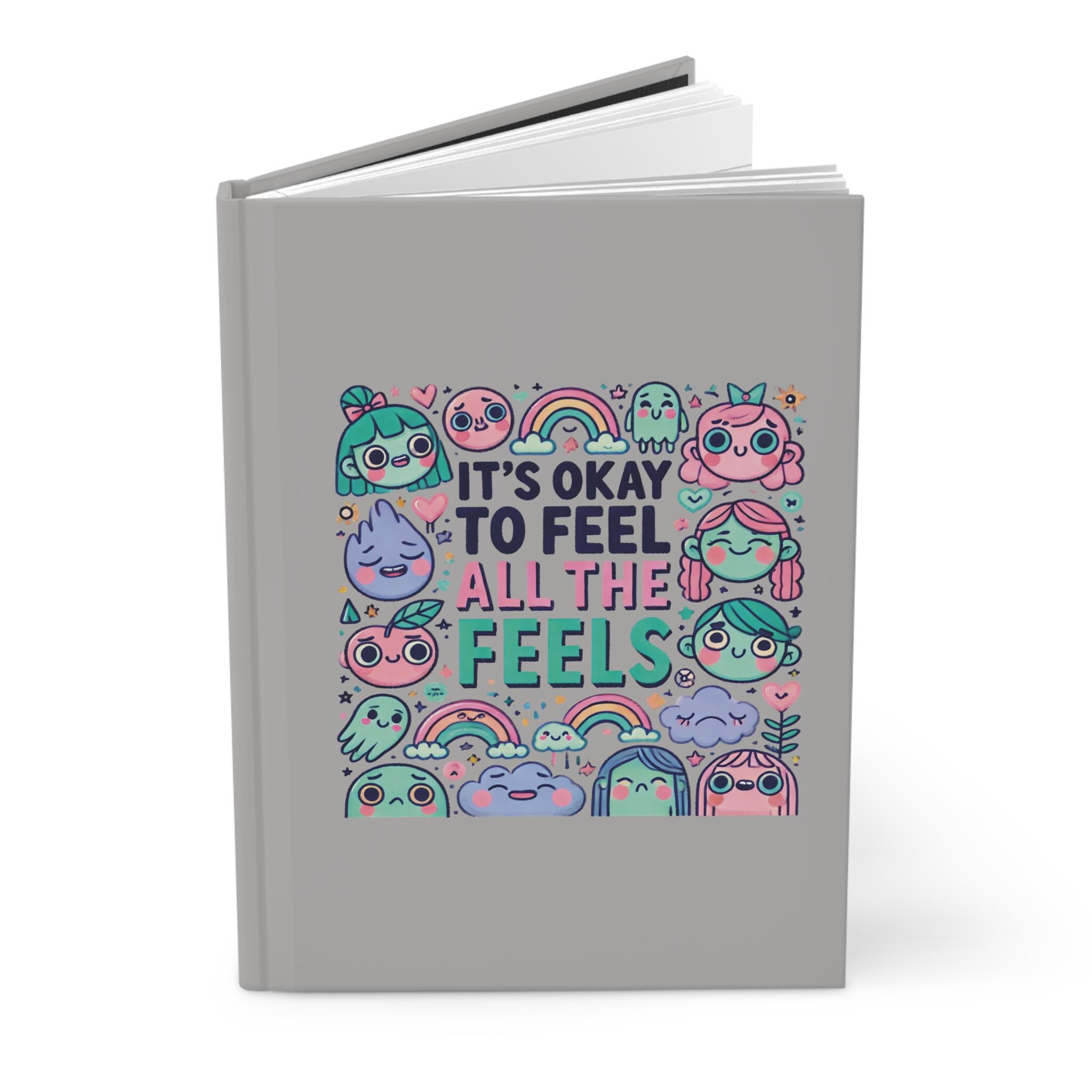 A vibrant matte finish journal featuring the quote, 'It okay to feel all the feels.' This journal allows you to express your emotions and thoughts stylishly and durably. Perfect for those who love to journal or as a thoughtful gift for friends and family. Relevant for self-care, mental health awareness, and everyday journaling.