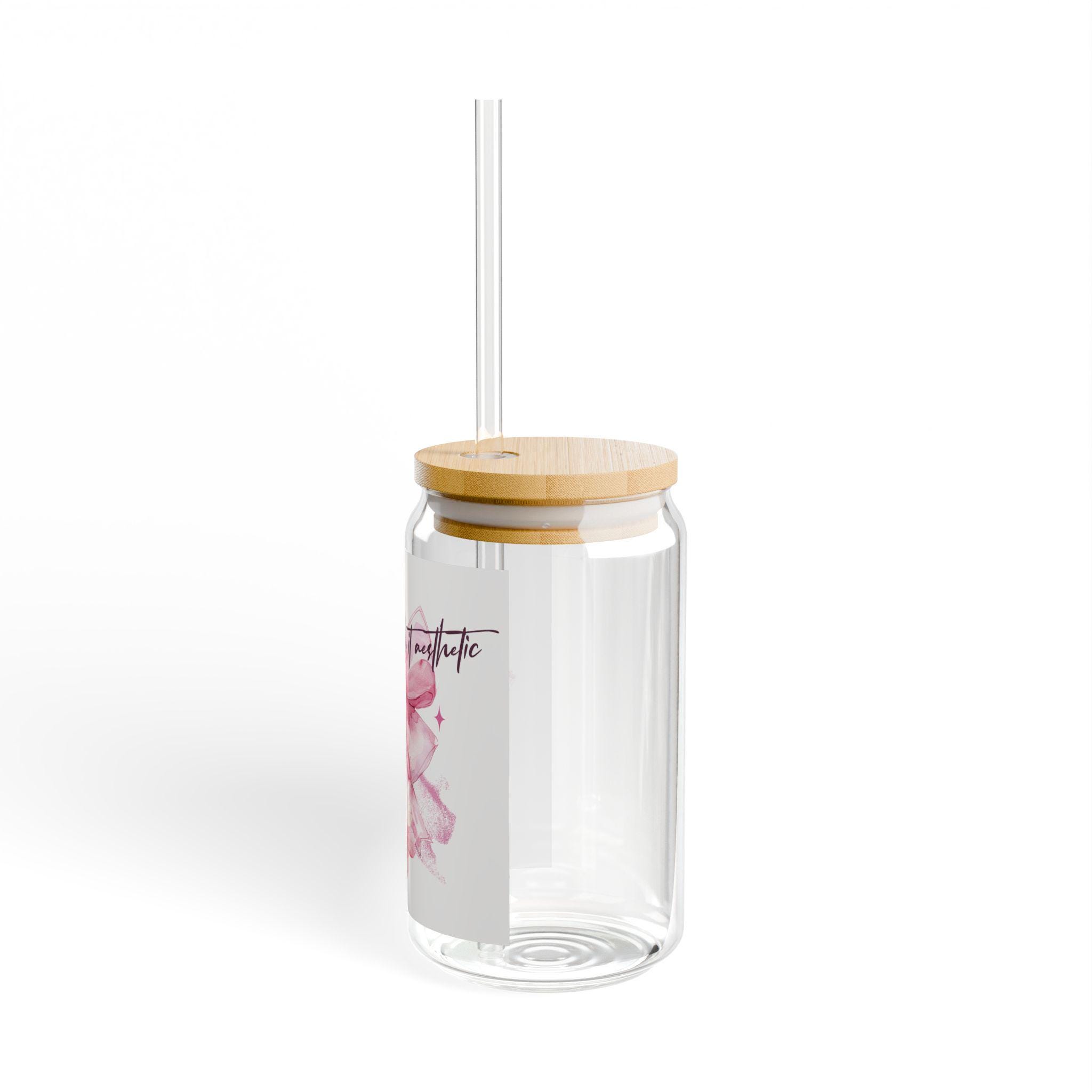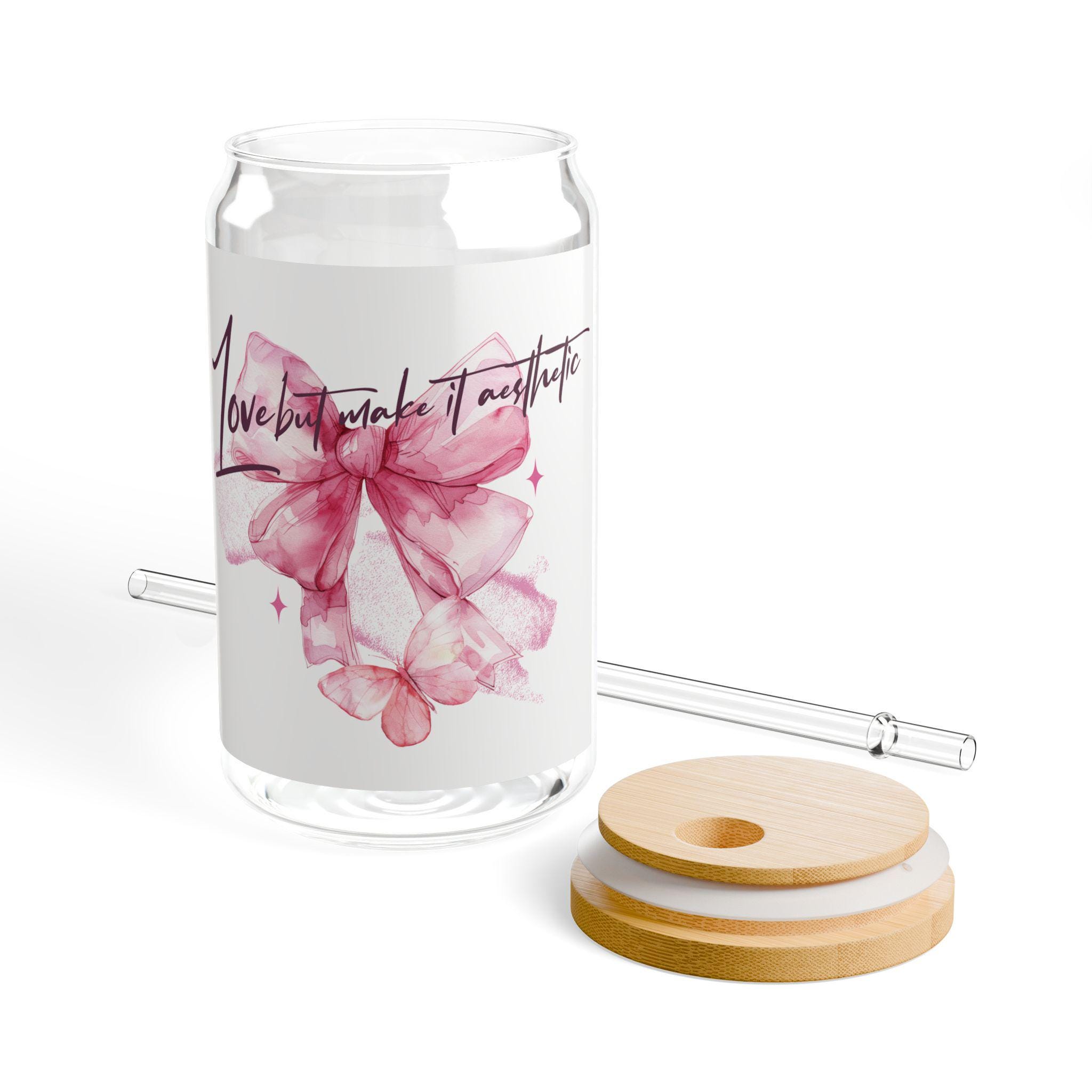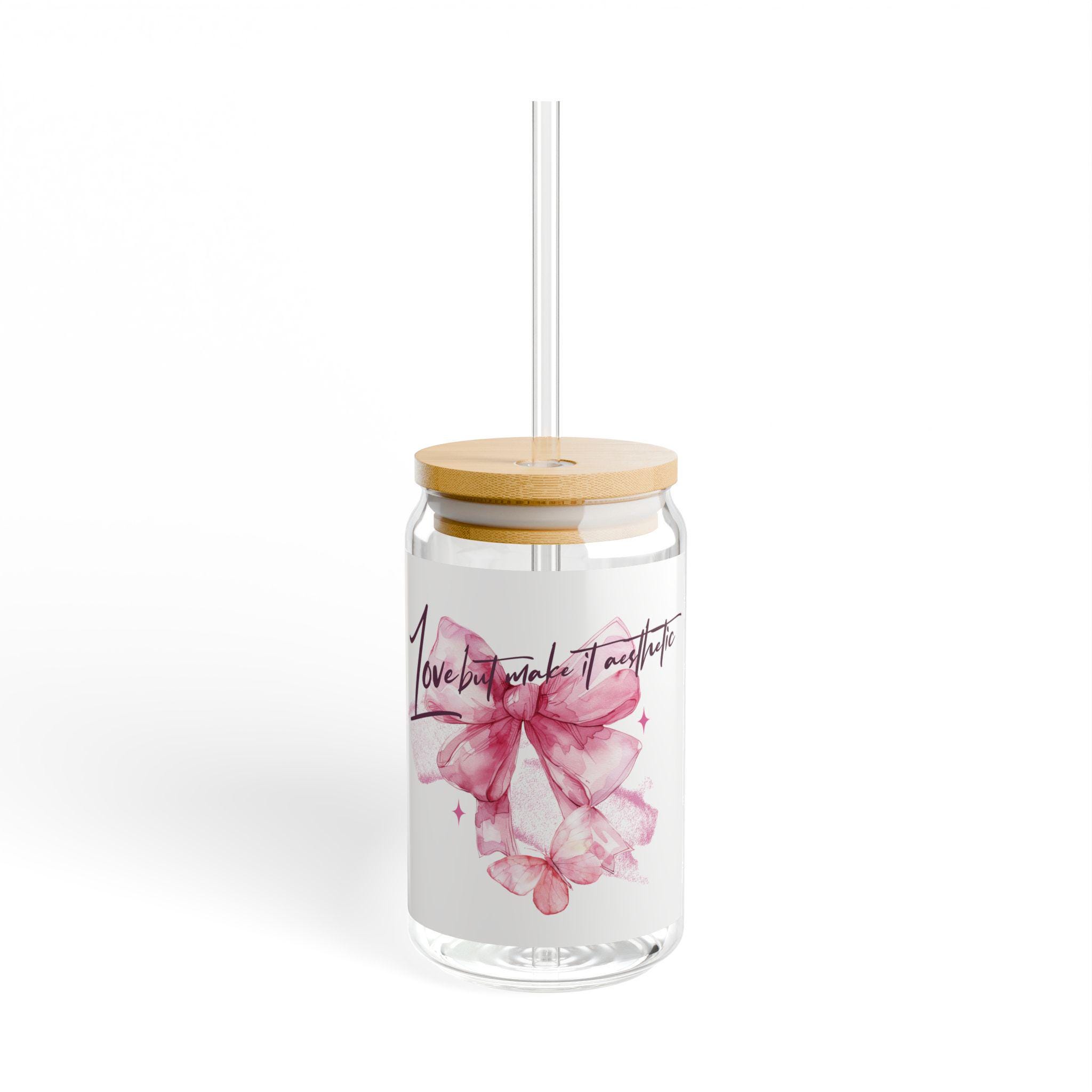 Aesthetic 16oz sipper glass with the quote 'love but make it aesthetic'. Perfect for adding a touch of style to your daily hydration routine. Ideal for those who appreciate trendy and unique drinkware. Great for birthdays, anniversaries, and self-care celebrations.