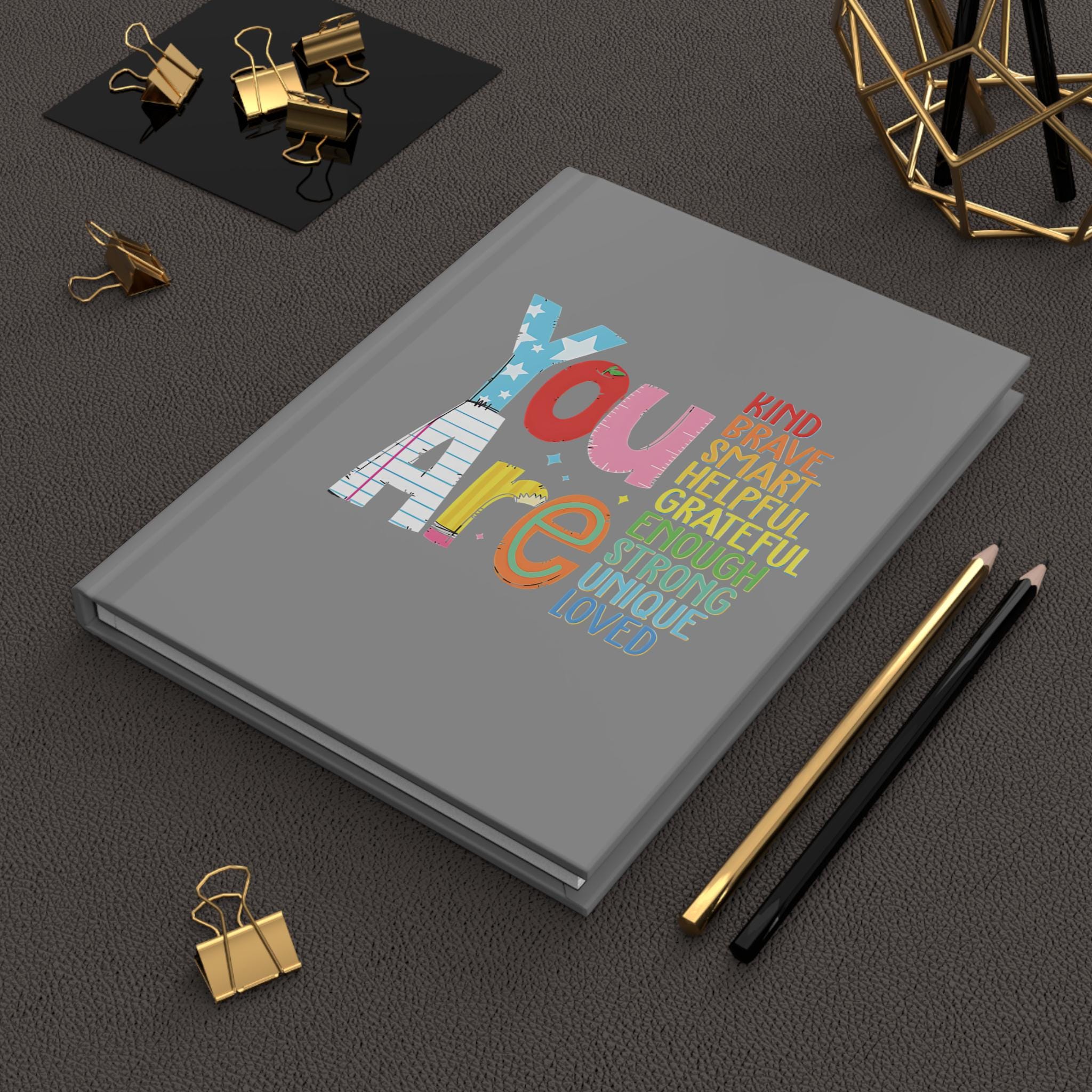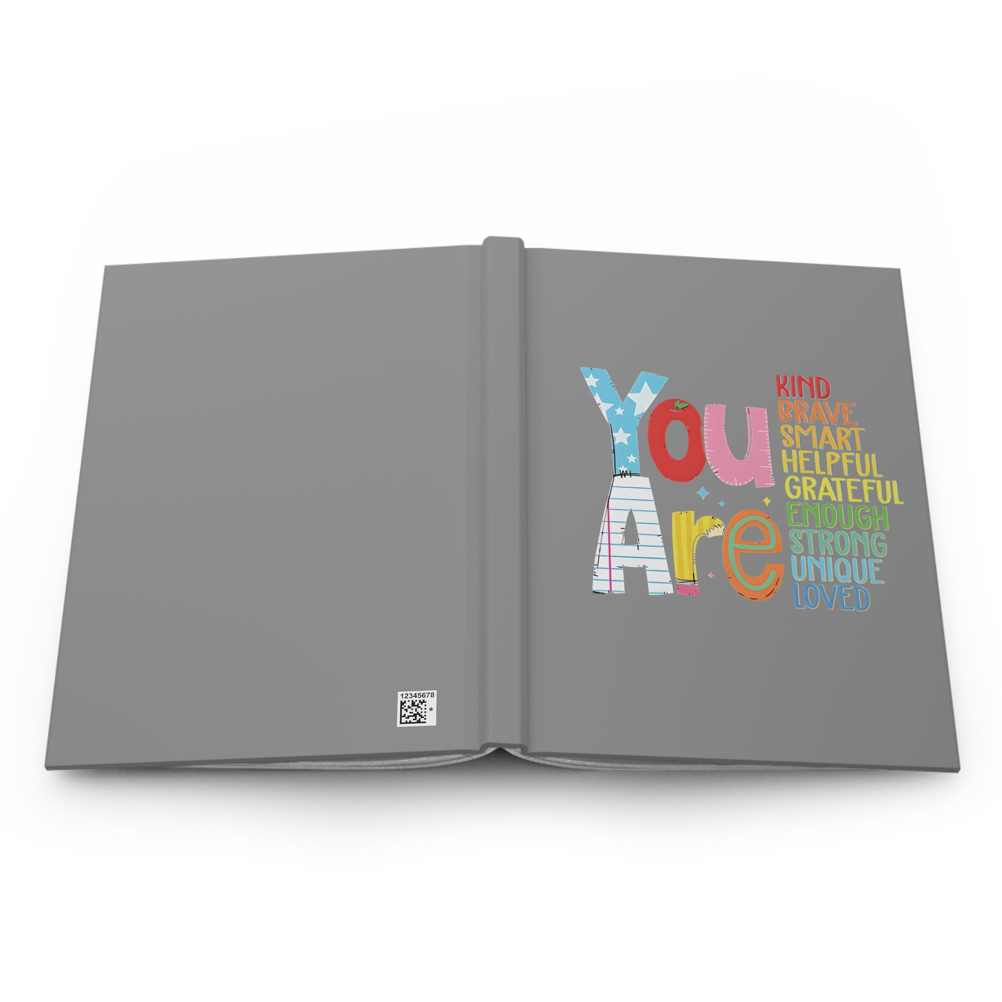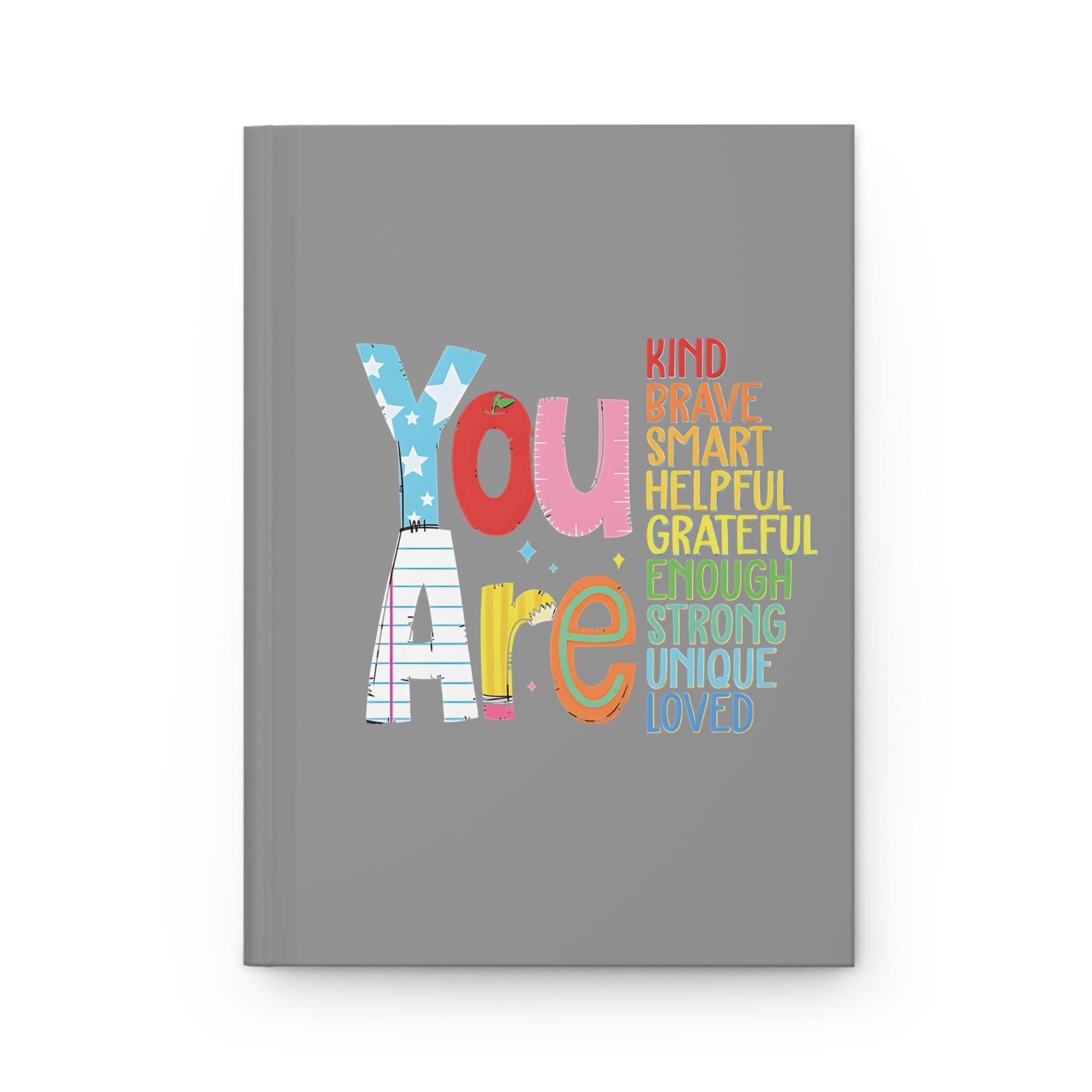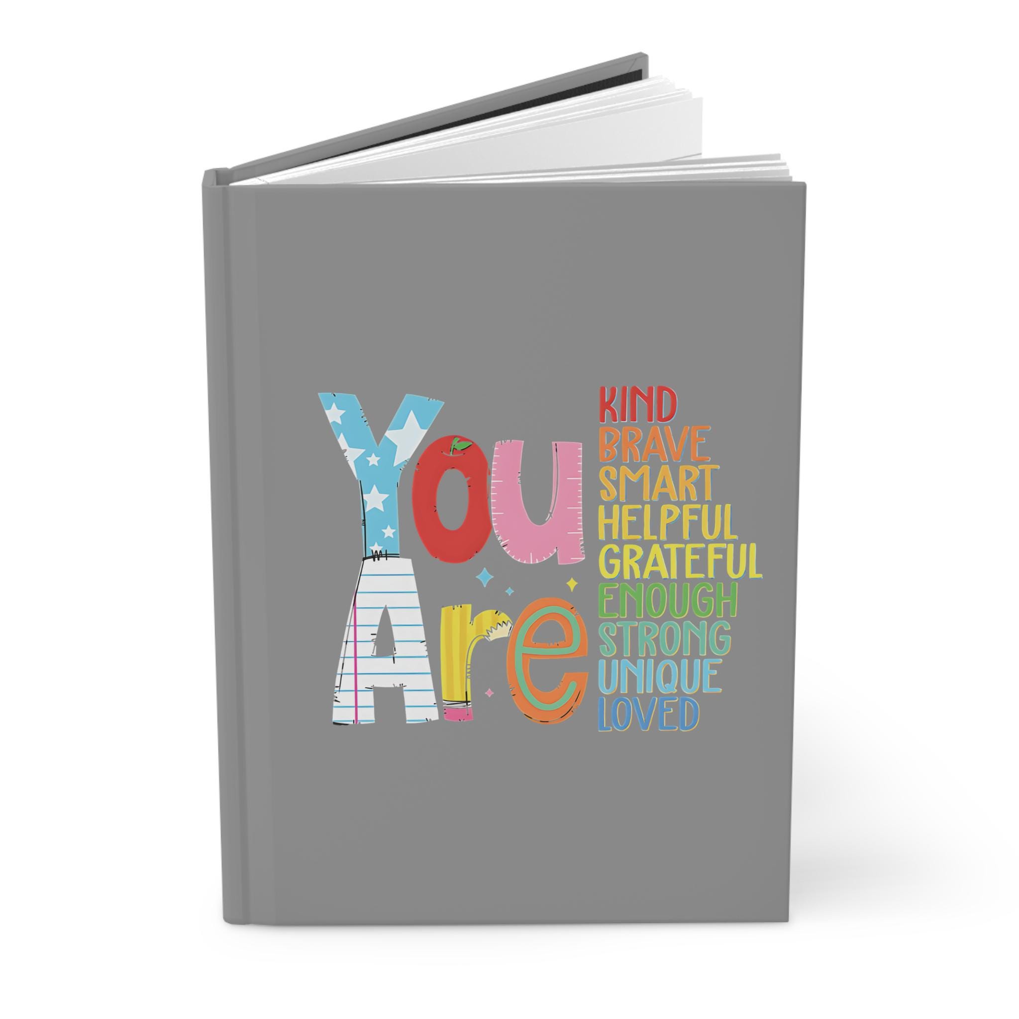 Capture the inspirational thoughts and affirmations w with this beautifully designed hardcover journal. Featuring a matte finish and the heartfelt quote, "You are kind, Brave, smart, helpful, grateful, enough, strong, unique and loved". This Affirmations book is perfect reminder of encouragement and empowering. Ideal for birthdays, graduations, or simply to uplift someone's spirits.