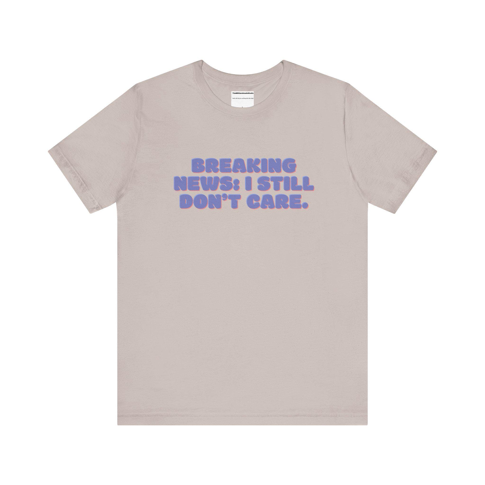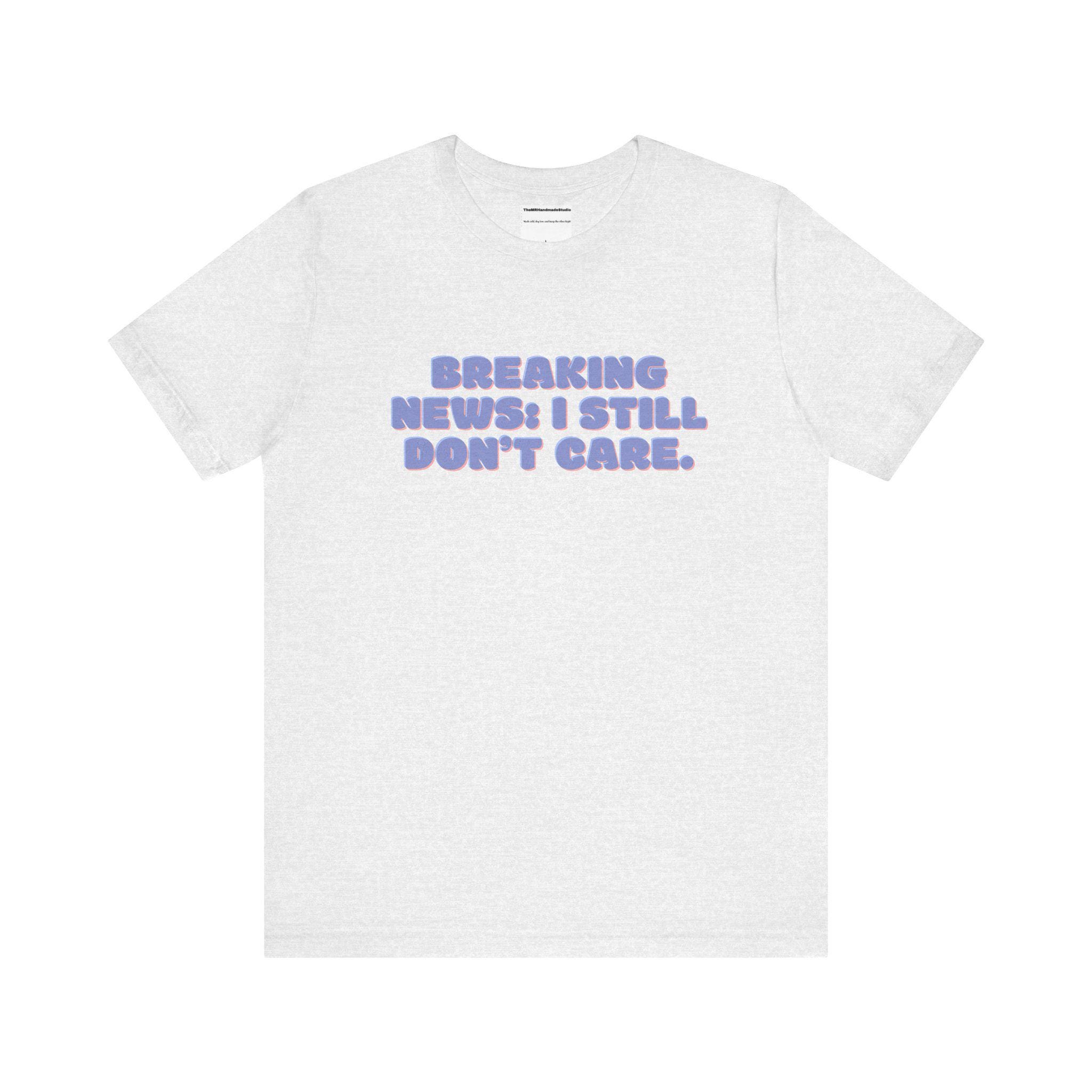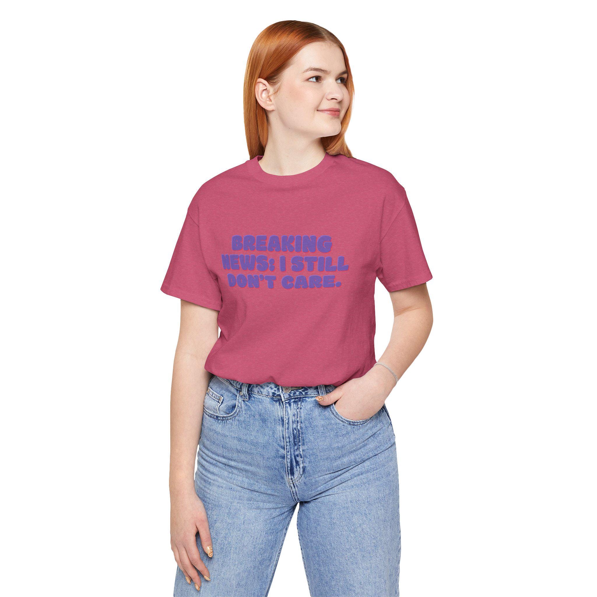 Let your t-shirt do the talking with our "Breaking News I Still Don’t Care" Unisex Jersey Short Sleeve Tee. Perfect for those moments when you're over it, this humorous tee will make a statement wherever you go. Crafted with soft, breathable fabric, this shirt offers comfort and style while letting everyone know you're too cool to be bothered.