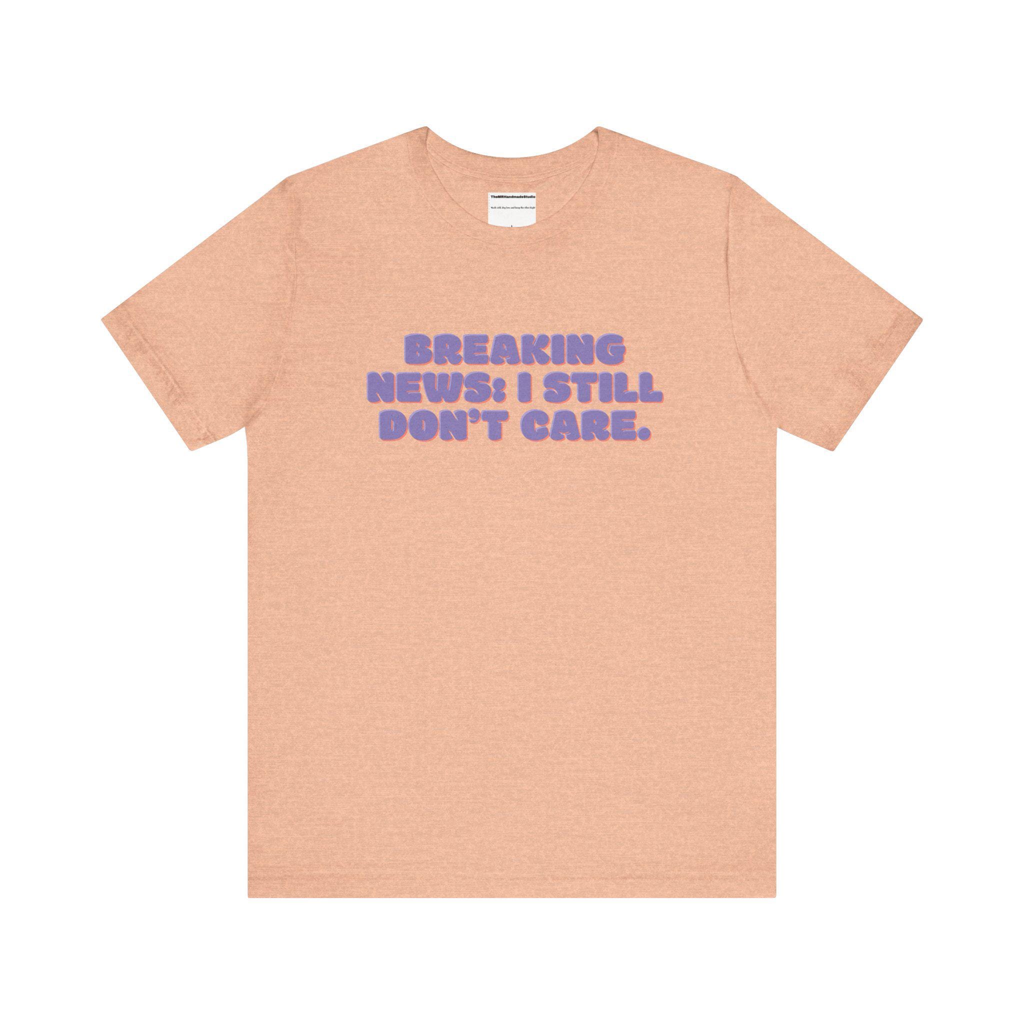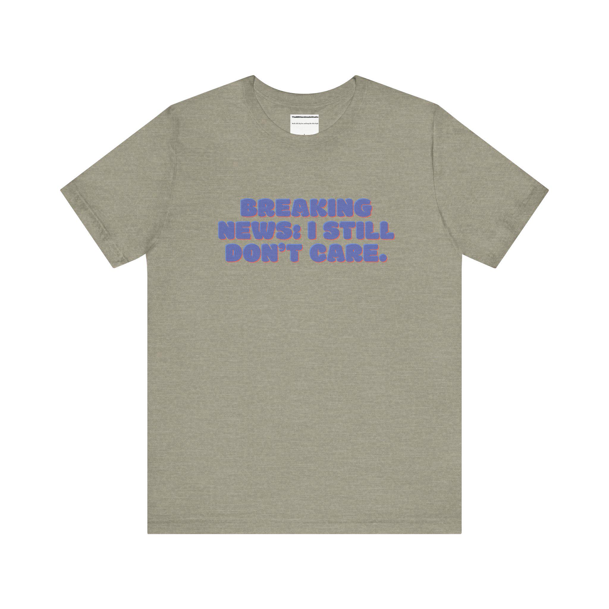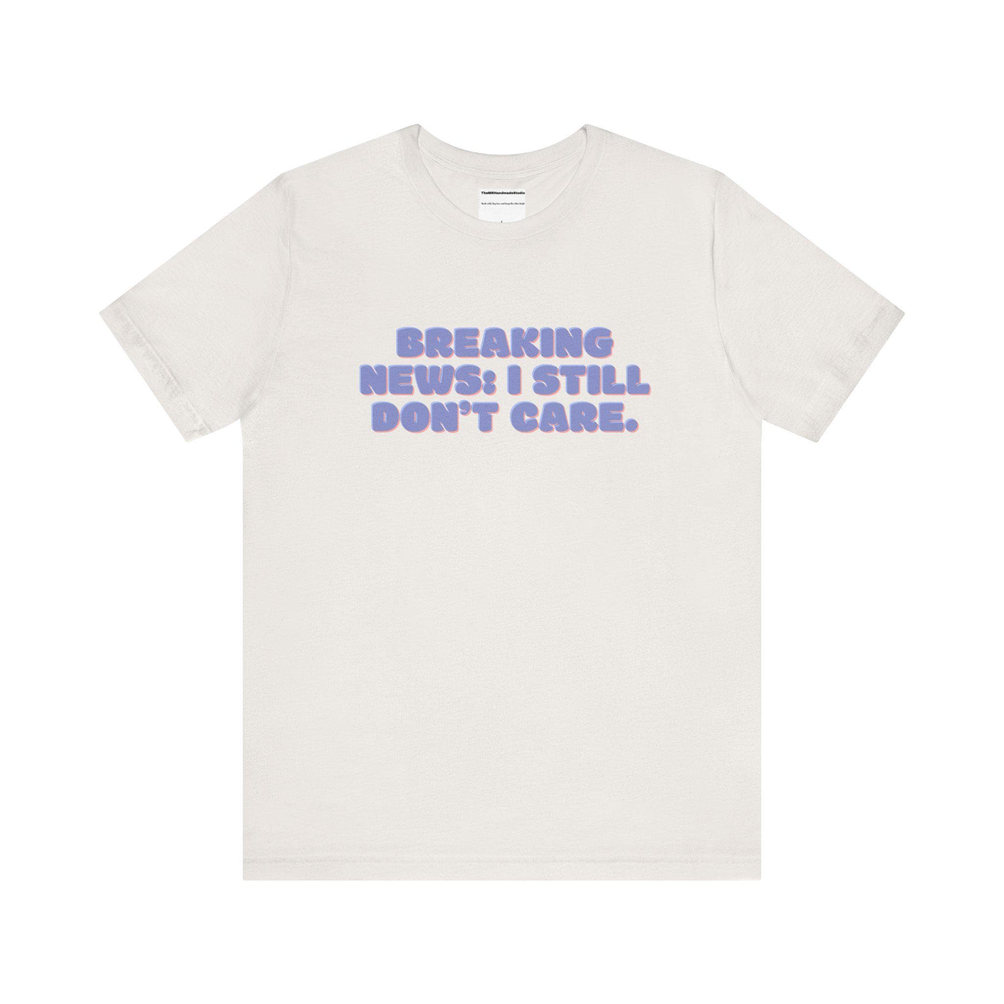 Let your t-shirt do the talking with our "Breaking News I Still Don’t Care" Unisex Jersey Short Sleeve Tee. Perfect for those moments when you're over it, this humorous tee will make a statement wherever you go. Crafted with soft, breathable fabric, this shirt offers comfort and style while letting everyone know you're too cool to be bothered.
