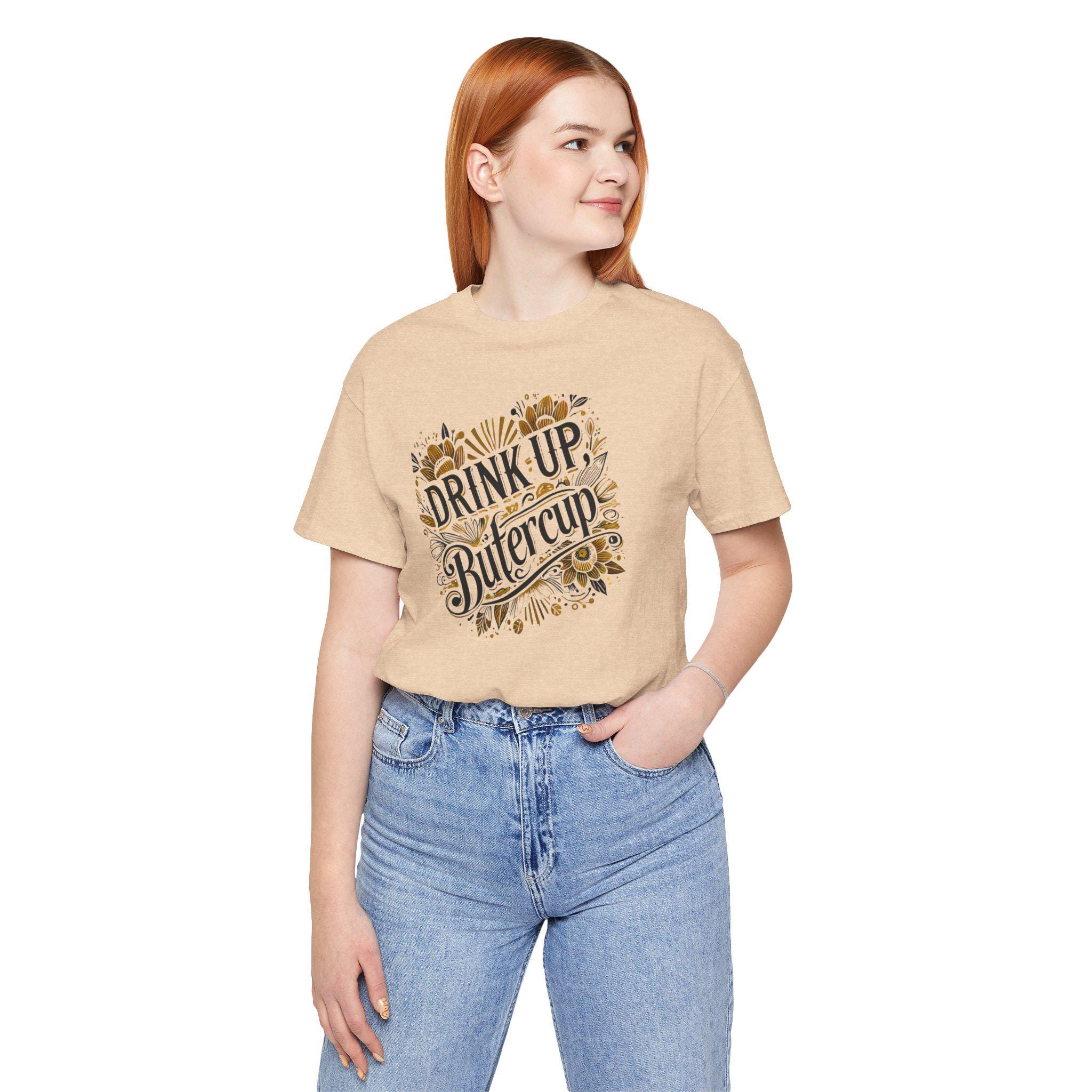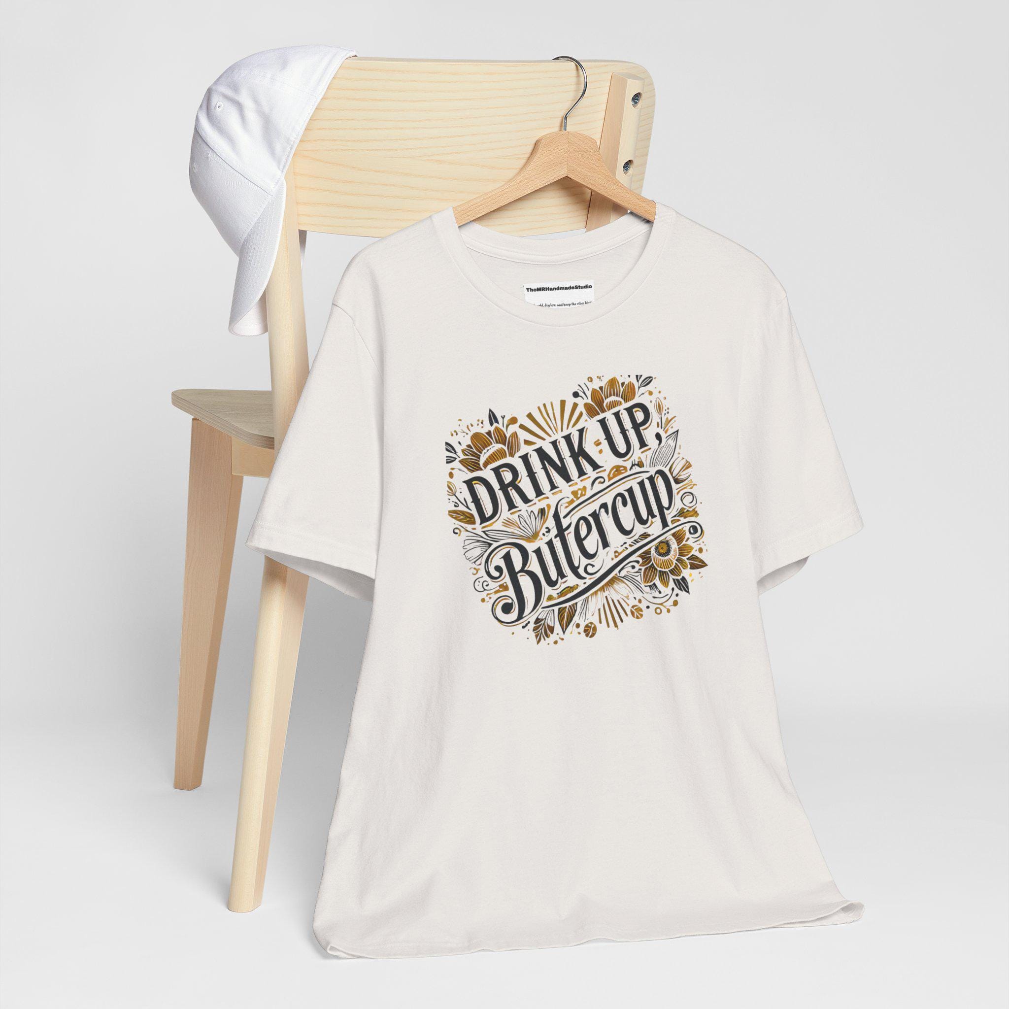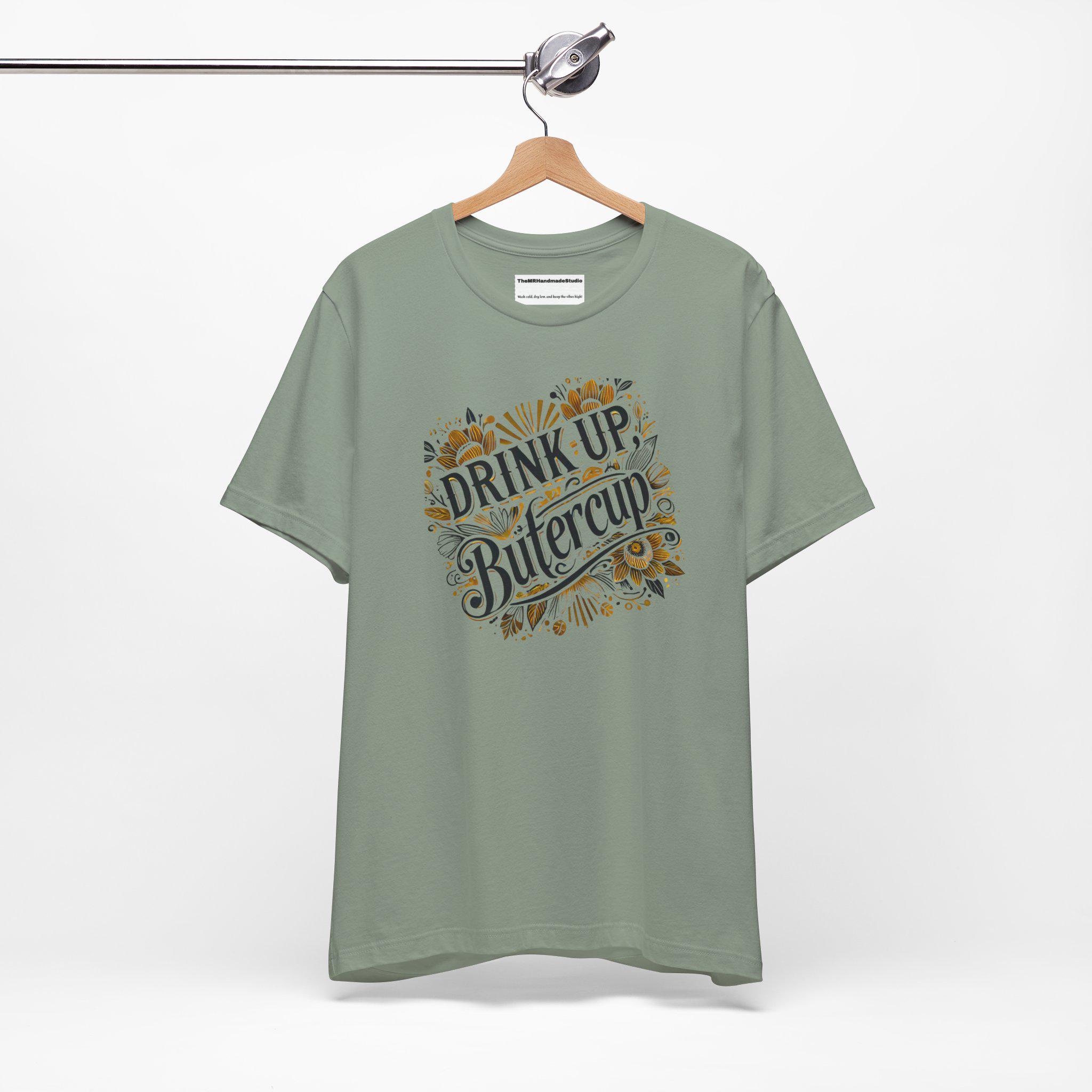 Trendy, tie-dye unisex tee shirt with the quote 'Drink up, Butter.' Perfect for casual wear or to make a statement. Ideal for those who love unique and eye-catching designs. Relevant for parties, festivals, and everyday wear.