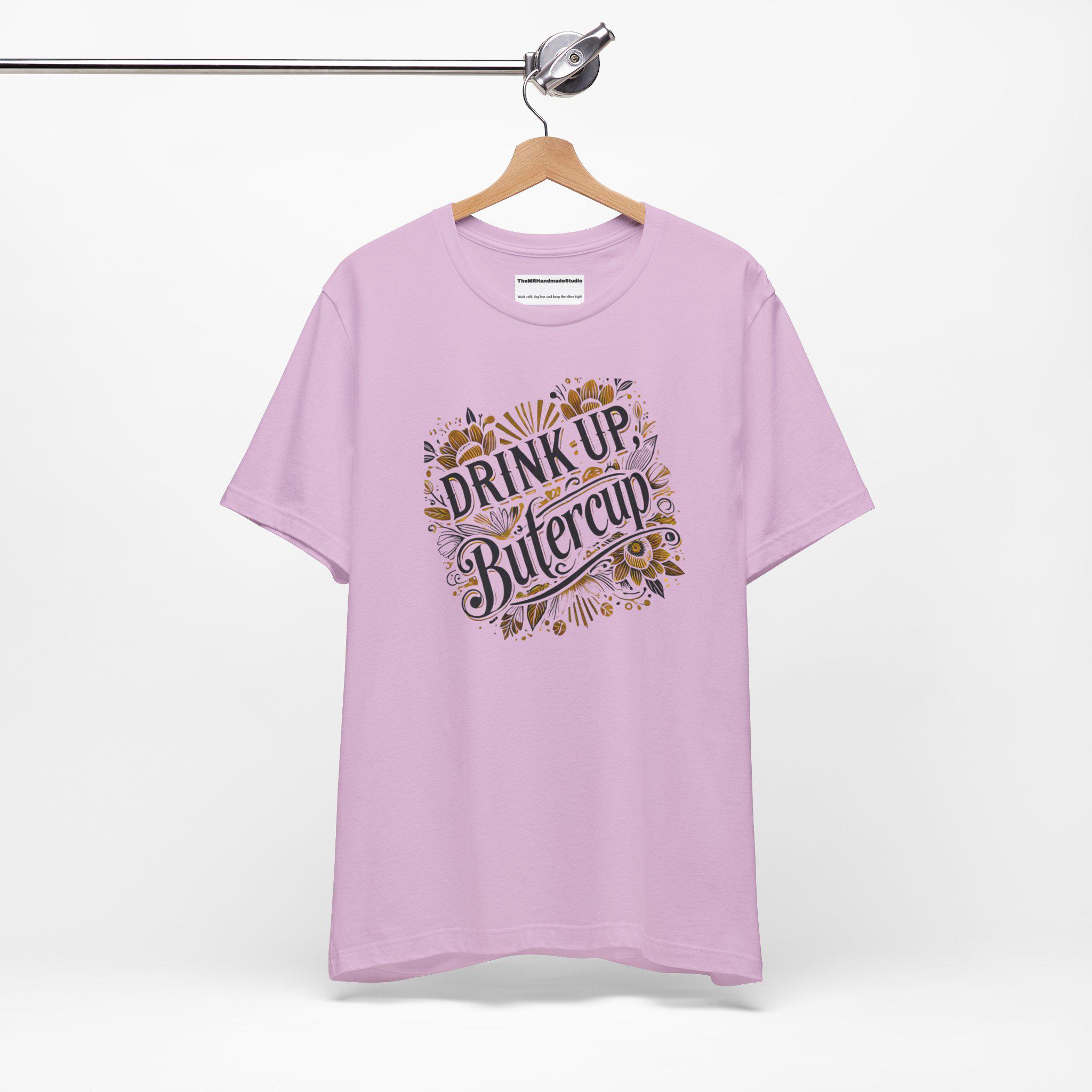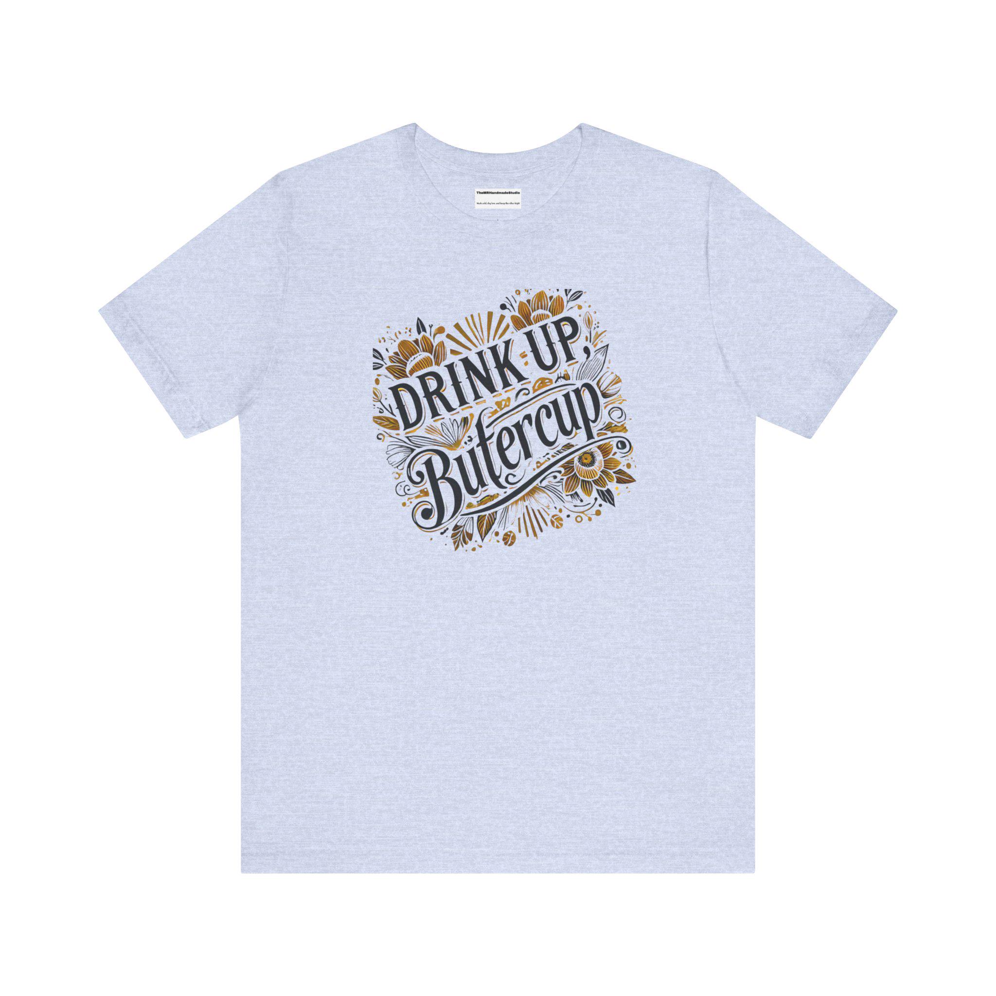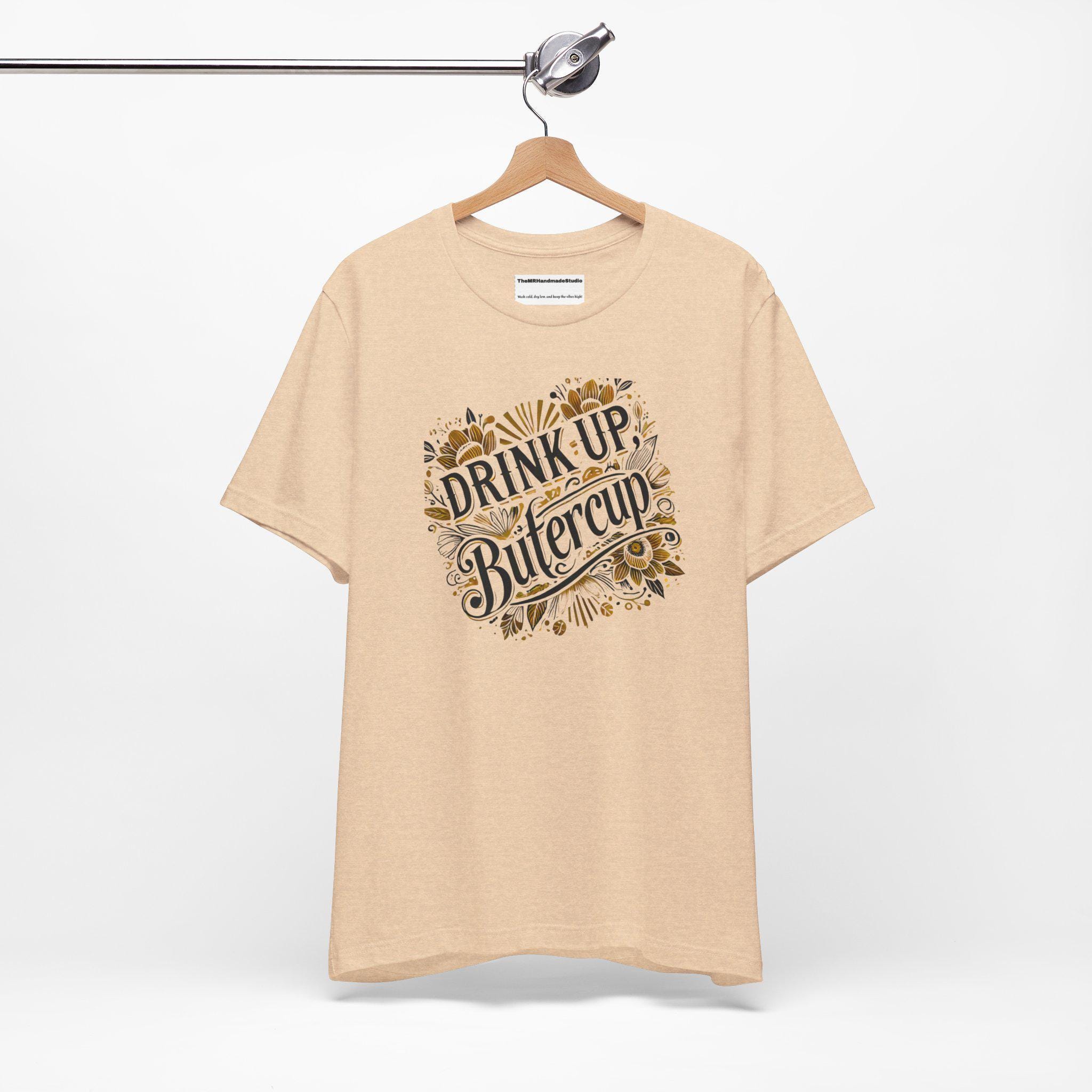 Trendy, tie-dye unisex tee shirt with the quote 'Drink up, Butter.' Perfect for casual wear or to make a statement. Ideal for those who love unique and eye-catching designs. Relevant for parties, festivals, and everyday wear.